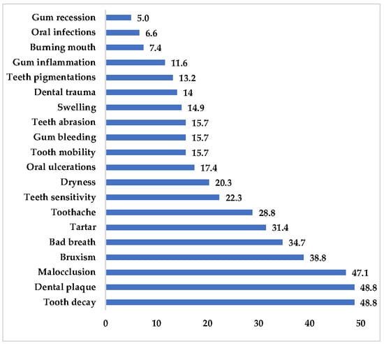 Figure 1 illustrates oral health problems reported by parents in the past 12 months. Nearly half of the children experienced dental caries (48.8%) or dental plaque (48.8%), followed by orthodontic issues such as malocclusion (47.1%). Other commonly reported problems included bruxism (38.8%), halitosis (34.7%), calculus (31.4%), and toothache (28.8%).