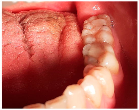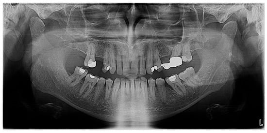 Assuming the hypothesis of a previously extracted first molar, the extent of the resulting space should be assessed, as the second molar appears to be excessively mesially inclined, leading to near-complete space closure at the crown level. Post-extraction migration follows various patterns, including the over-eruption of opposing teeth, horizontal migration of neighboring teeth, space reduced by tipping, dual drift (horizontal and vertical), or complete space closure; the latter being more likely to occur in the maxilla than in the mandible [29,30]. In the study by Teo et al. (2016), where they examined the spontaneous space closure after the extraction of lower first permanent molars in children, various parameters were assessed, including the chronological age, developmental stage of second permanent molars, presence of third molars and the direction of the angulation of the second permanent molars and premolars [31]. Mesial tipping of the second molar led to the most spontaneous space closure following first molar extraction, where 85% of these cases had complete space closure [31]. In a similar study by Ciftci et al. (2021), 52.5% of the 177 mandibular second molars exhibited successful space closure after first molar extraction [32]. It seems that evidence from the literature could support the nearly complete space closure observed in this case, after the possible extraction of the first molar; therefore, the remaining teeth can be identified as the second and third molars.