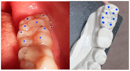 The occlusal surface of the molar: clinical view and the relevant cast (blue dots indicate the cusps).