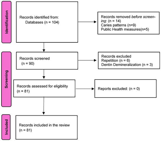 The total number of sources from the Database was 104 papers, where 98 were included in the review, and the analysis consisted only of 57 (42 laboratory studies and 15 RCT) studies, and 24 systemic scoping reviews; 9 papers were excluded for not meeting eligibility criteria before the analysis, where 3 papers were included in the total number of references, but 6 were excluded completely. The main outcomes are represented in Table 1, comparing the remineralizing and antibacterial abilities of different new remineralizing agents to those of fluoride. The formal risk of bias was not included in this scoping review. The following items of the PRISMA 2020 checklist, 18, 19, 20b, 20c, 20d, 21, and 22, were not conducted.