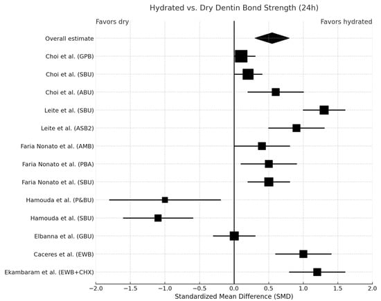 Forest plot of the 24 h microtensile bond strength for adhesives applied to hydrated versus dry dentin surfaces [22,39,45,46,48,49,50]. The pooled standardized mean difference (SMD) favors hydrated conditions (SMD = +1.20; 95% CI: 0.52–1.86; p < 0.001), although substantial heterogeneity is observed (I2 = 93.4%). In Hamouda et al. [50], aggregation into the hydrated group resulted in both adhesives appearing to favor dry bonding; however, at the adhesive level, Prime&Bond Universal indeed favored dry dentin, while Scotchbond Universal favored moist dentin (Table 5). This illustrates how solvent-dependent differences may be masked when conditions are combined for meta-analysis.