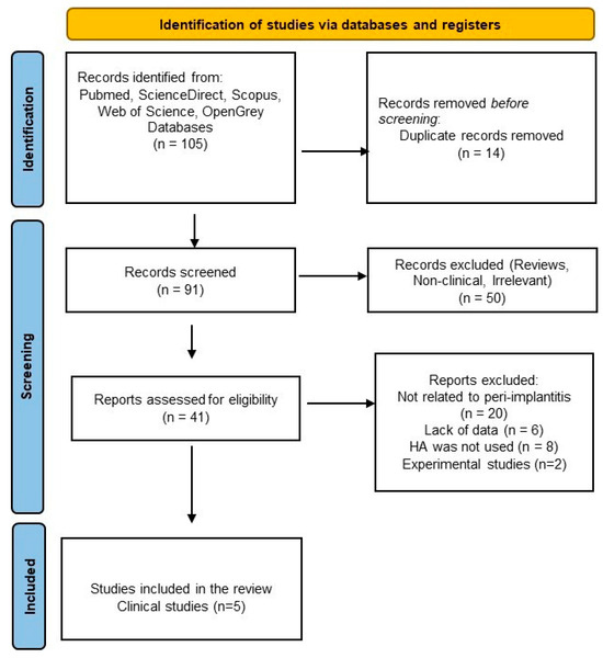 This scoping review was conducted according to Preferred Reporting Items for Systematic reviews and Meta-Analyses extension for Scoping Reviews (PRISMA-ScR) guidelines [63,64,65]. A Patient–Concept/Exposure–Context/Outcome (PCC/PEO) modified version of the PICO (Population, Intervention, Comparison, Outcome) model was applied for this review to formulate focused questions and to determine and assess the outcomes of this oral health setting [66,67]. The PCC model applied for this review followed three main elements: Population—patients with peri-implantitis/peri-implant disease/dental implant failure; Concept—HA used as treatment strategy in peri-implantitis management; Context/Outcome—no limitation was applied for any type of specific cultural setting.