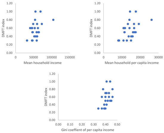 In Sri Lanka, mean DMFT was higher among the 12-year-old children in the districts where mean per capita household income and mean household income was higher. The correlations between mean household income and mean DMFT (r = 0.47, 95% CI: 0.1–0.7, p = 0.01) and between mean per capita household income and mean DMFT (r = 0.47, 95% CI: 0.09–0.7, p = 0.01) were positive moderate correlations and were statistically significant (Table 2 and Figure 1). The higher the mean per capita household income and mean household income, the higher was the mean number of decayed teeth (DT) [r = 0.46, 95% CI: 0.02–0.6, p = 0.04] and mean number of filled teeth (FT) [r = 0.46, 95% CI: 0.07–0.7, p = 0.02] (Table 2 and Figure 1). Mean DMFT was positively correlated with the Gini coefficient of per capita income (r = 0.42, 95% CI: 0.03–0.7, p = 0.03) (Table 2).