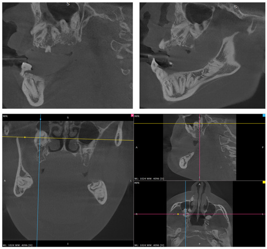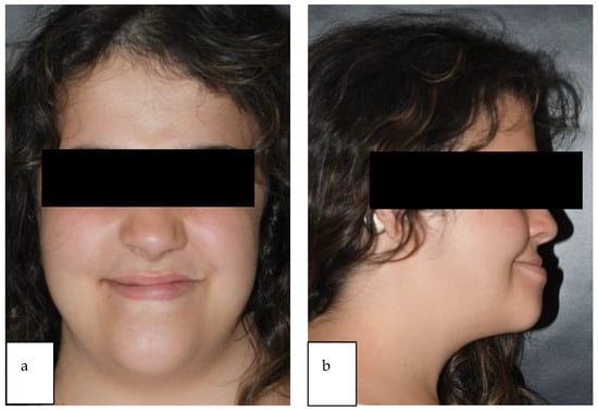 Extraoral examination revealed facial asymmetry, a dolichofacial growth pattern, and a concave facial profile (Figure 1a,b). As for the patient’s dental situation, intraoral clinical evaluation showed the presence of teeth 3.1, 5.3, and 7.4, along with a root remnant likely corresponding to 2.5 (Figure 2a,b,c,d,e). She showed a skeletal class III relationship due to the absence of erupted teeth. The patient’s mandible appeared prognathic, while the maxilla was severely hypoplastic [19,20]. The orthopantomography (OPG) revealed the presence of multiple impacted teeth, most of which exhibited abnormal morphology and incomplete development (Figure 3) [21]. The OPG was acquired using standard panoramic settings (66–70 kVp, 8–10 mA, exposure time 12–14 s) to obtain a comprehensive overview of dental development, impactions, and bone morphology. CBCT imaging was performed using a small-to-medium field of view (FOV 8 × 8 cm), 90 kVp, 5 mA, and a voxel size of 0.2 mm, allowing detailed assessment of tooth morphology, root development, and three-dimensional spatial relationships essential for treatment planning. Cone-beam computed tomography (CBCT) confirmed the findings and aided in treatment planning (Figure 4) [22]. Clinical photographs and radiographic records were collected, and the patient was enrolled in a multidisciplinary dental and prosthetic rehabilitation program.
