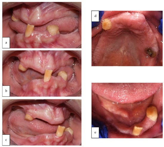 (a–e): Intraoral pictures. The images illustrate the clinical status of near-complete edentulism.