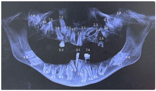 The Orthopantomography (OPG) image displays the patient’s dentition with numerical labeling of the dental elements, using the standard FDI (Fédération Dentaire Internationale) system.