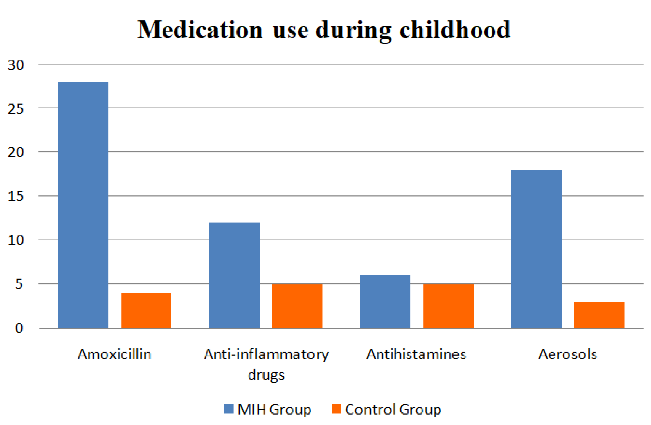 | Medicine | MIH Group | Control Group | Pearson’s Chi-Squared Test | Fisher’s Exact Test |