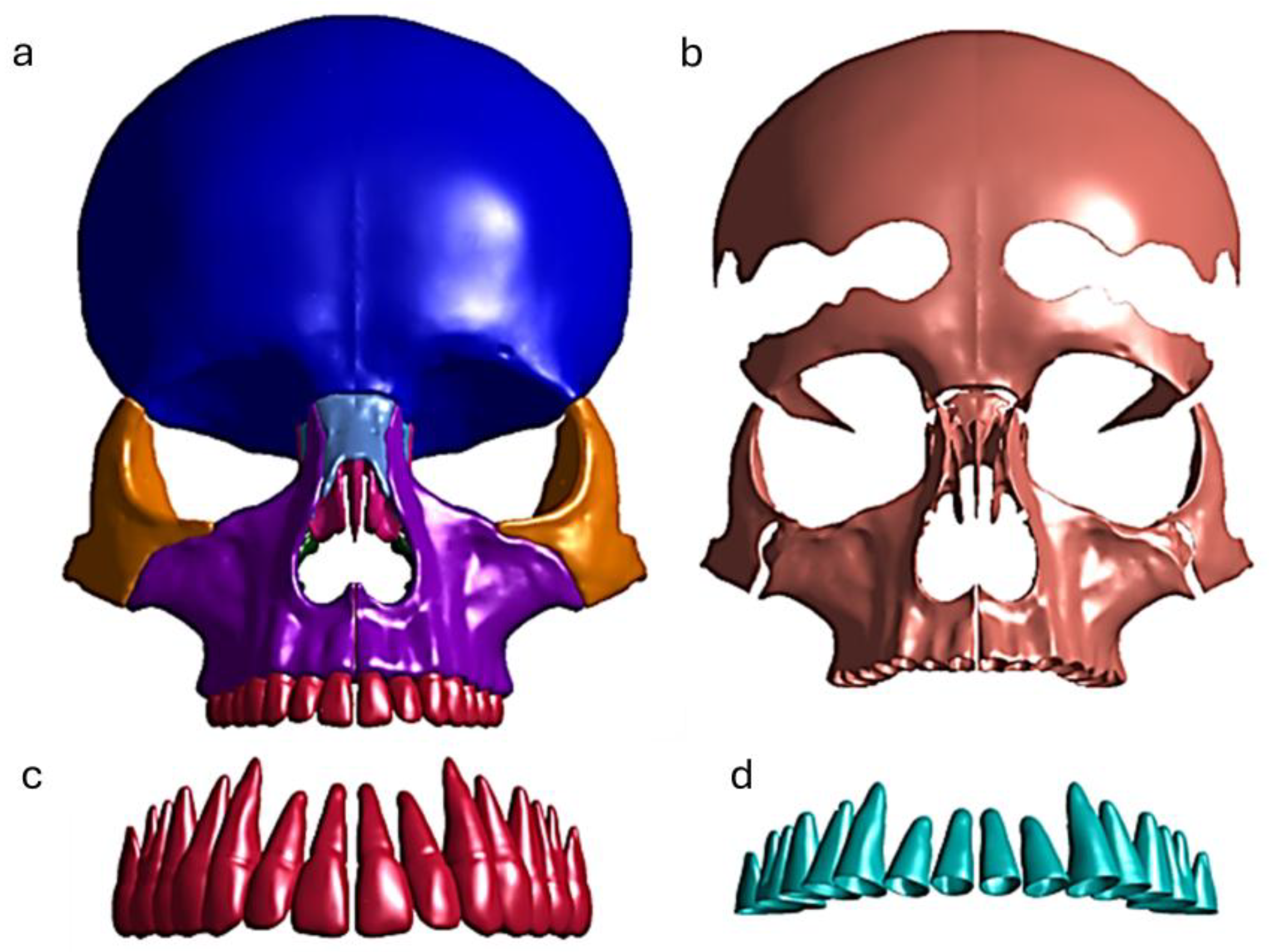 - Popowics, T.E.; Herring, S.W. Load transmission in the nasofrontal suture of the pig, Sus scrofa. J. Biomech. 2007, 40, 837–844. [Google Scholar] [CrossRef]