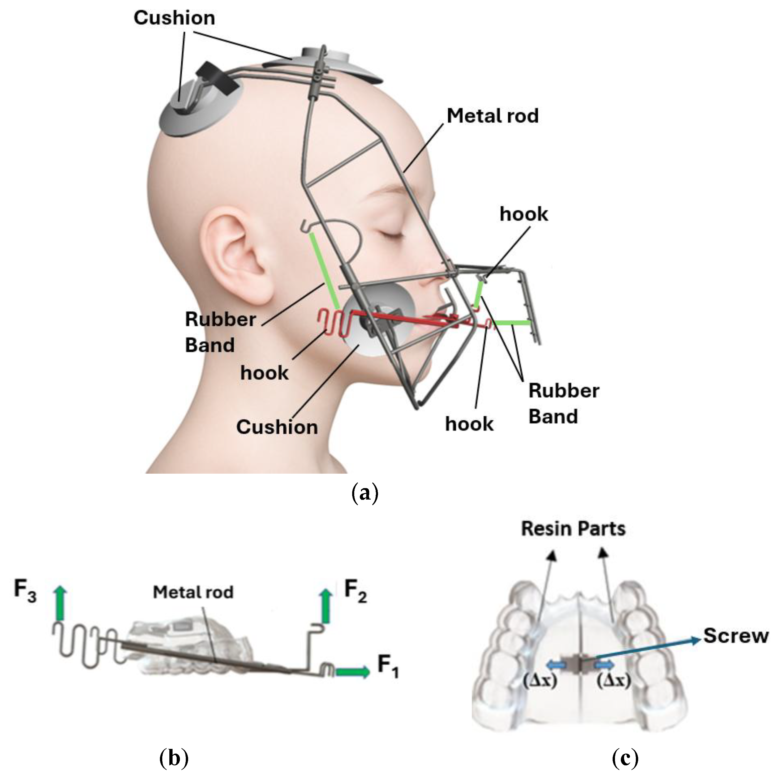 - Moshfeghi, M.; Mitani, Y.; Choi, B.; Emamy, P. Finite element simulations of the effects of an extraoral device, RAMPA, on anterosuperior protraction of maxillae and comparison with gHu-1 intraoral device. ANGEL Orthod. 2021, 91, 804–814. [Google Scholar] [CrossRef] [PubMed]
