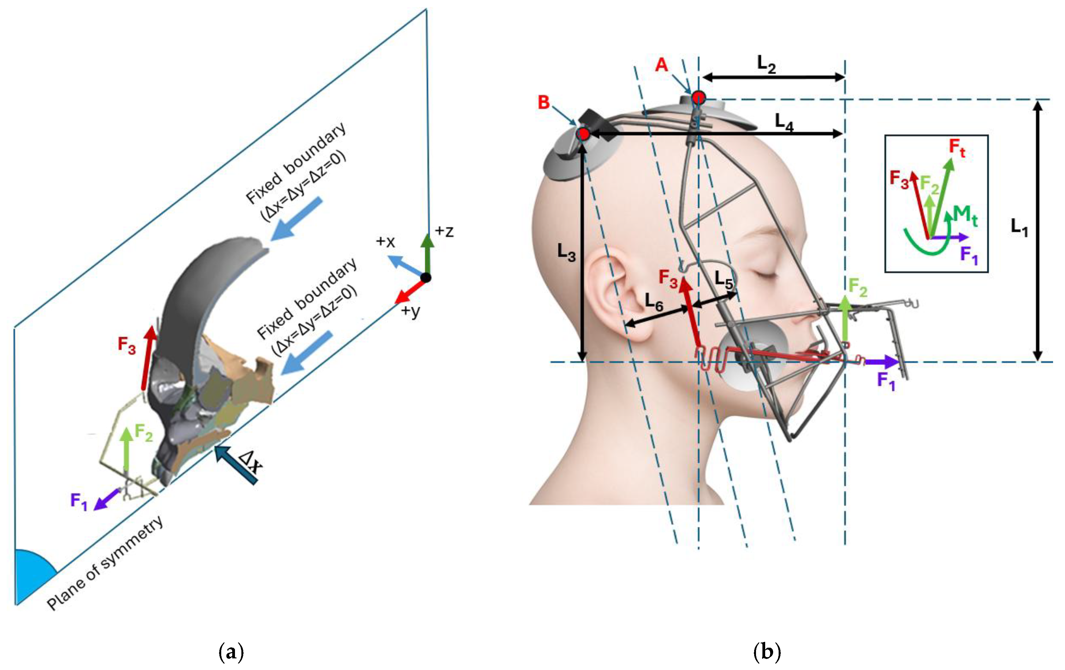 - Mitani, Y.; Choi, B.; Choi, J. Anterosuperior protraction of maxillae using the extraoral device, RAMPA; finite element method. Comput. Methods Biomech. Biomed. Eng. 2018, 21, 722–729. [Google Scholar] [CrossRef]