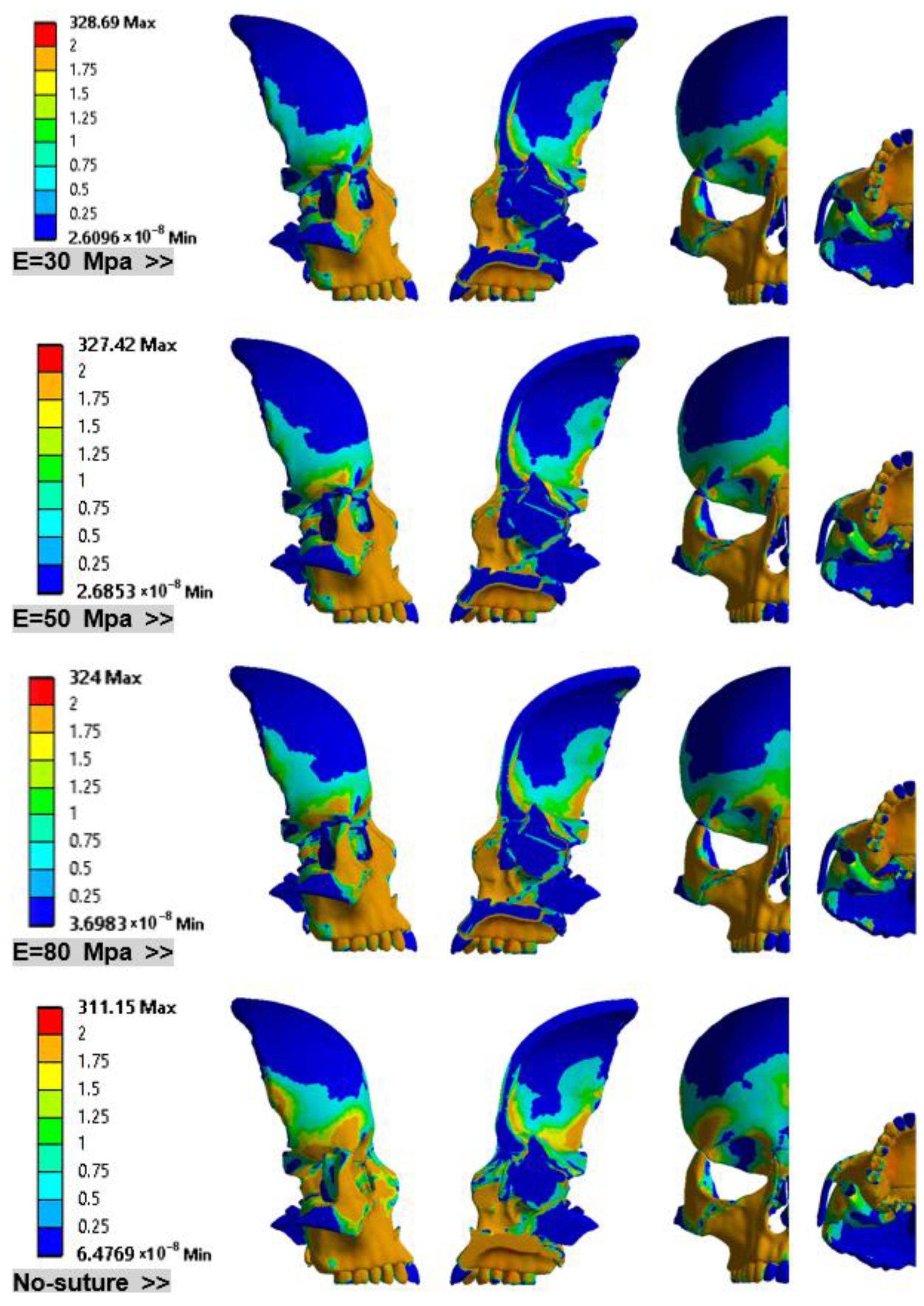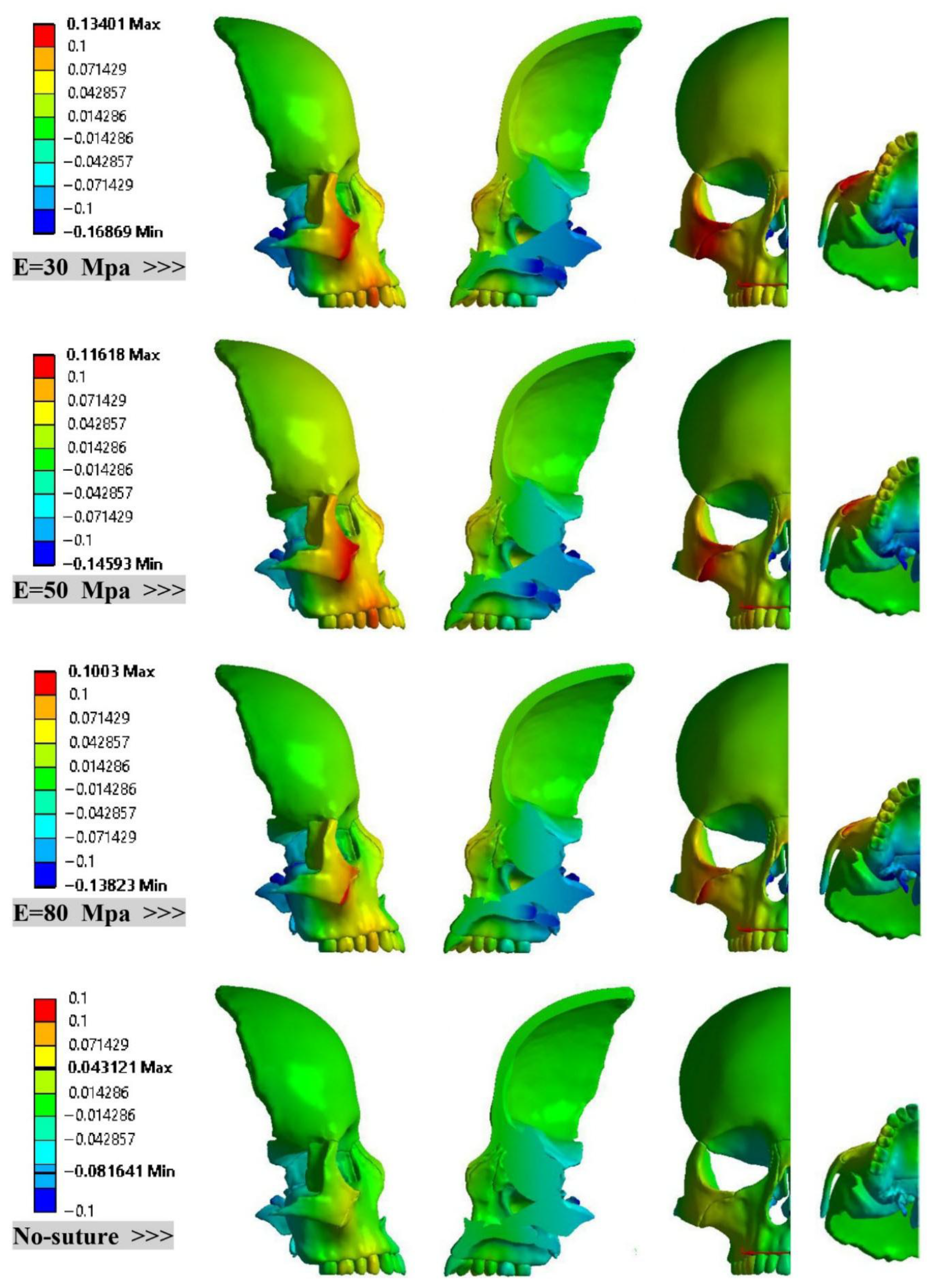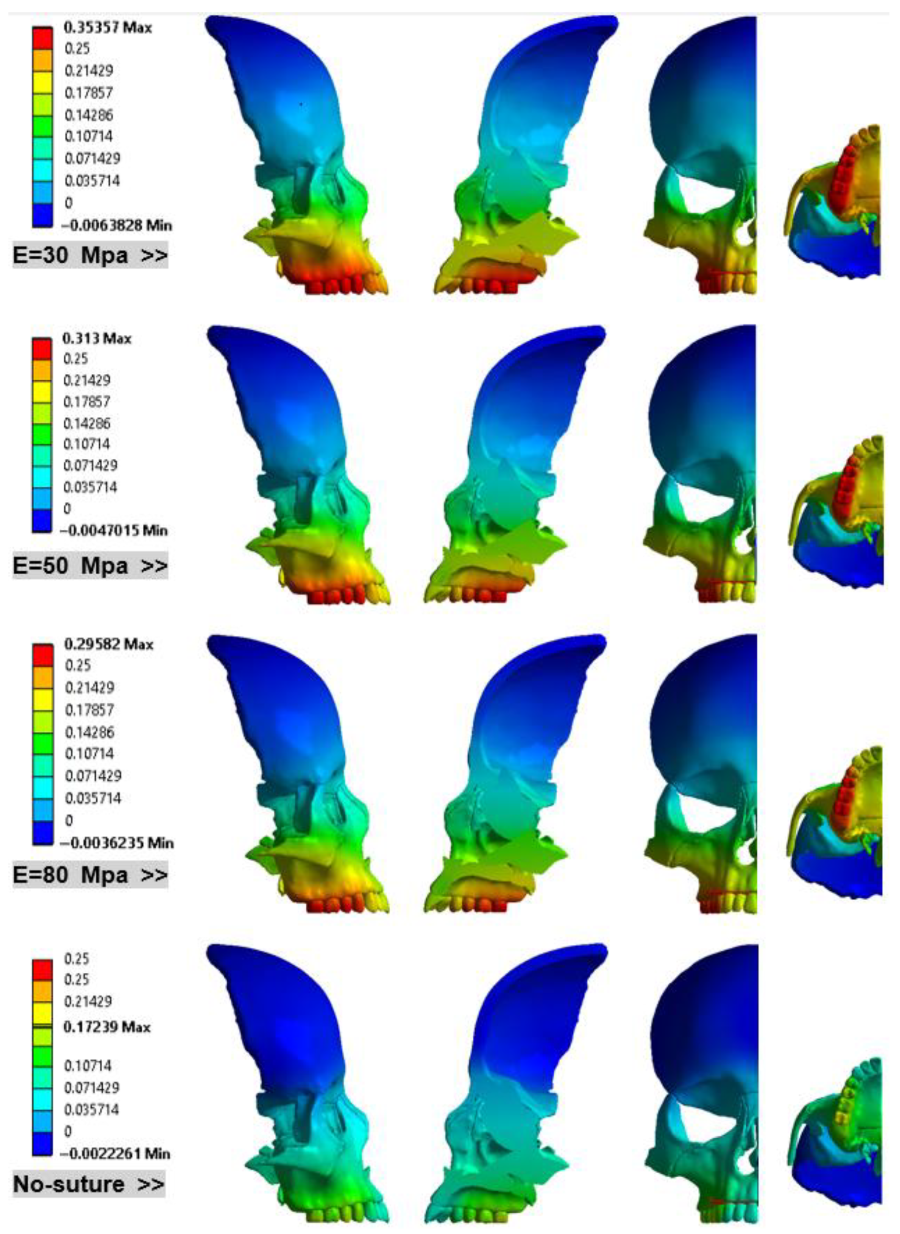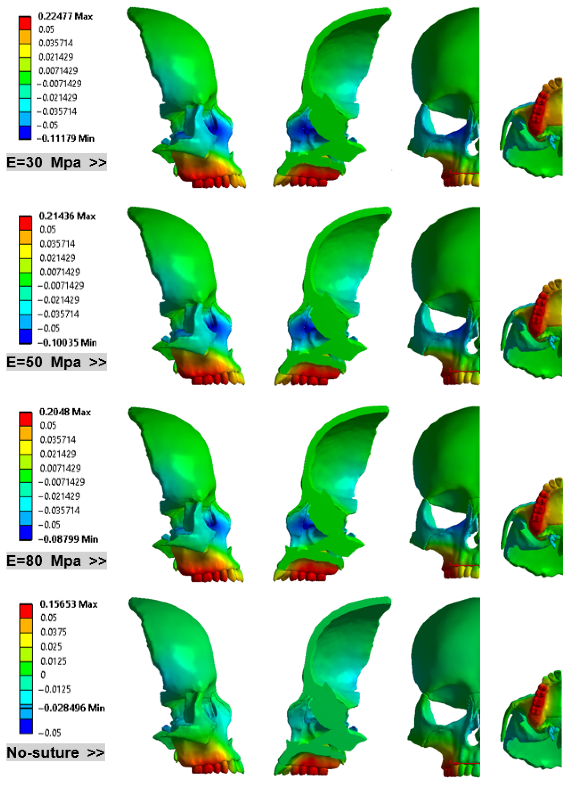 - Consistent Linear Displacement Slopes: Models incorporating sutures demonstrate consistent linear displacement slopes (approximately 15%) in the X, Y, and Z directions. The locations of minimum and maximum displacements remain unchanged across these sutured models. However, the rigid (no-suture) model predicts significantly different patterns and values for both minimum and maximum displacements.