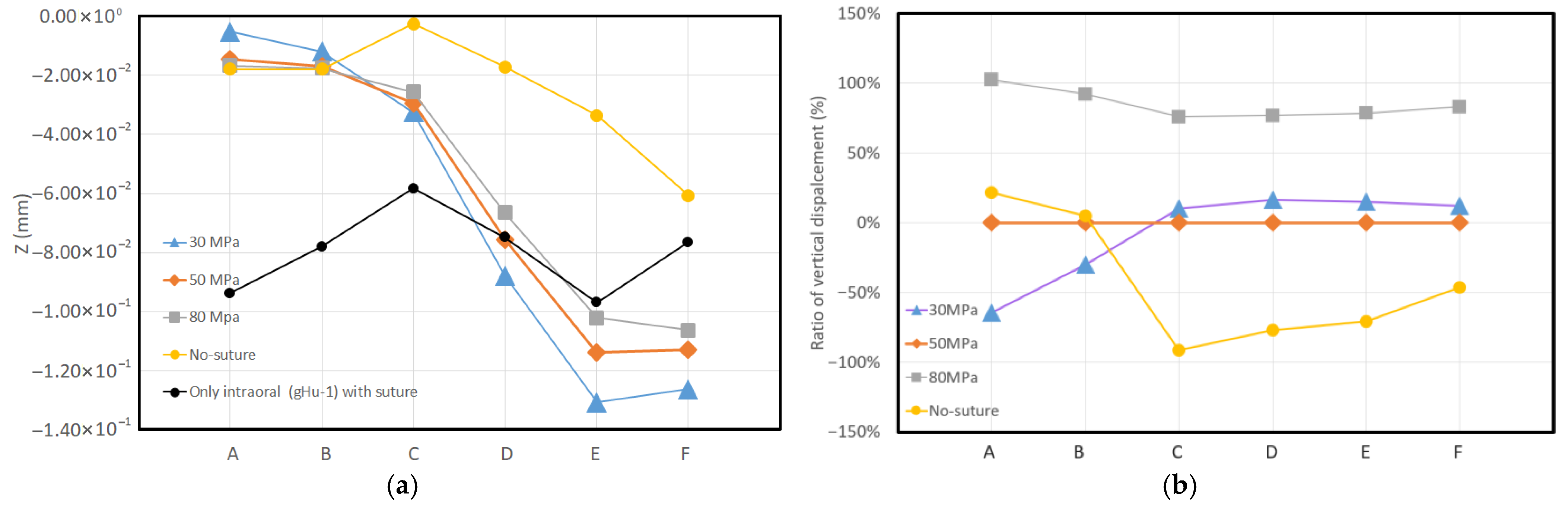 Point | Case 1 (30 MPa) | Case 2 (50 MPa) | Case 3 (80 MPa) | Case 4 (No-Suture) | ||||||||