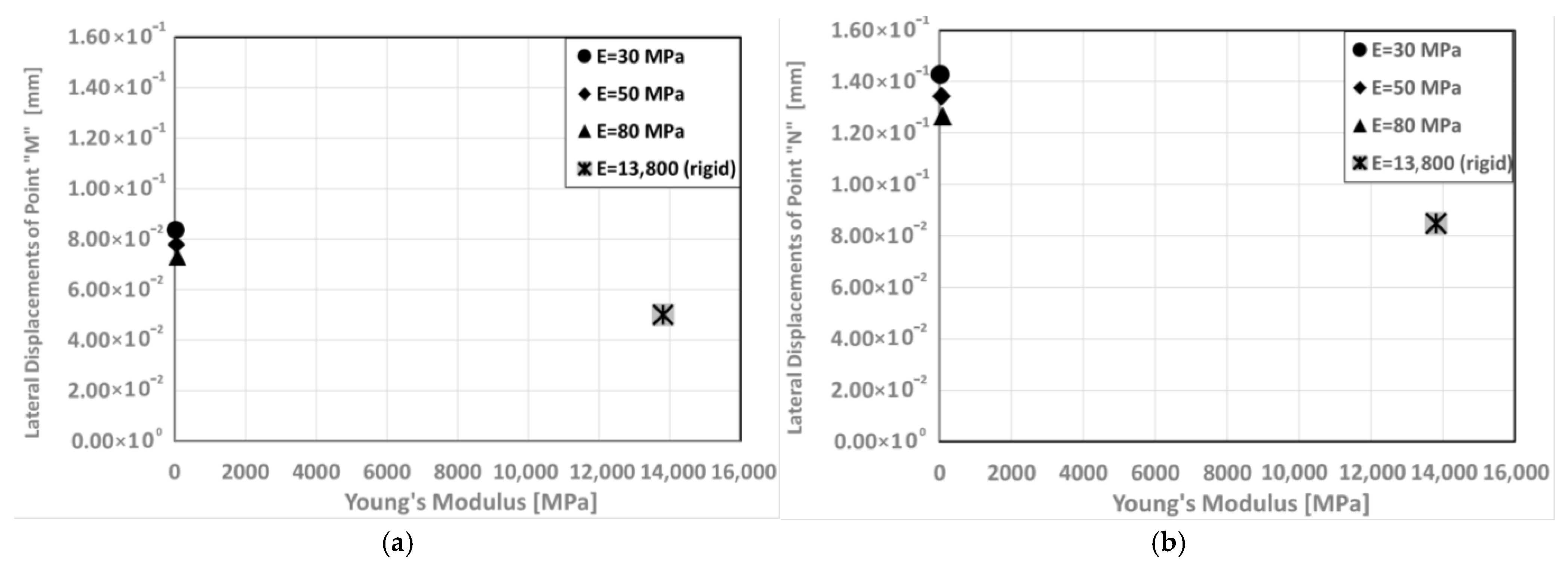 - Lateral Expansion of Maxillary bone: Figure 11 investigates the displacements of point M and N in the lateral direction in models with different Young’s modulus.