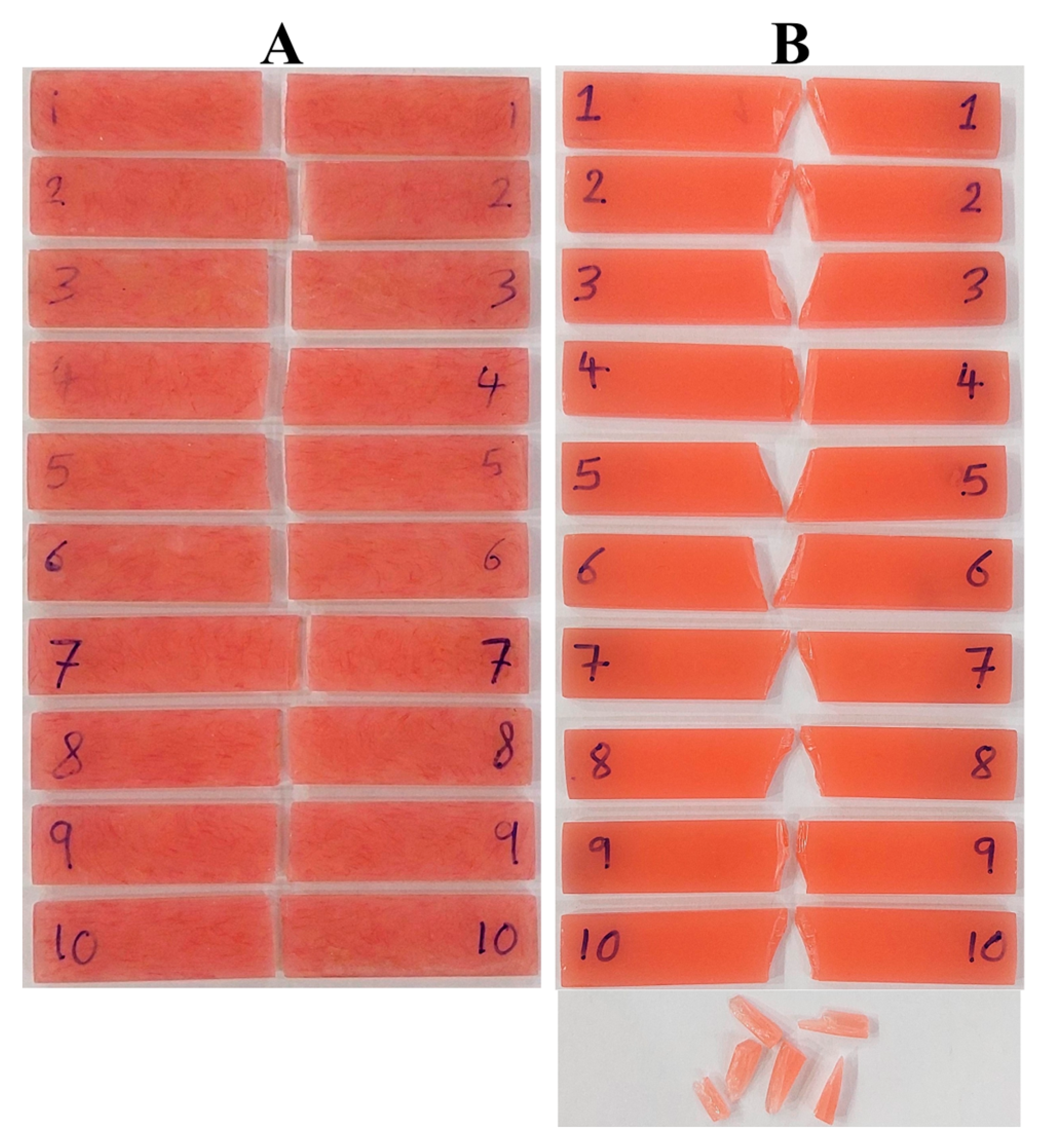 - Gharechahi, J.; Asadzadeh, N.; Shahabian, F.; Gharechahi, M. Flexural Strength of Acrylic Resin Denture Bases Processed by Two Different Methods. J. Dent. Res. Dent. Clin. Dent. Prospects 2014, 8, 148–152. [Google Scholar] [CrossRef]