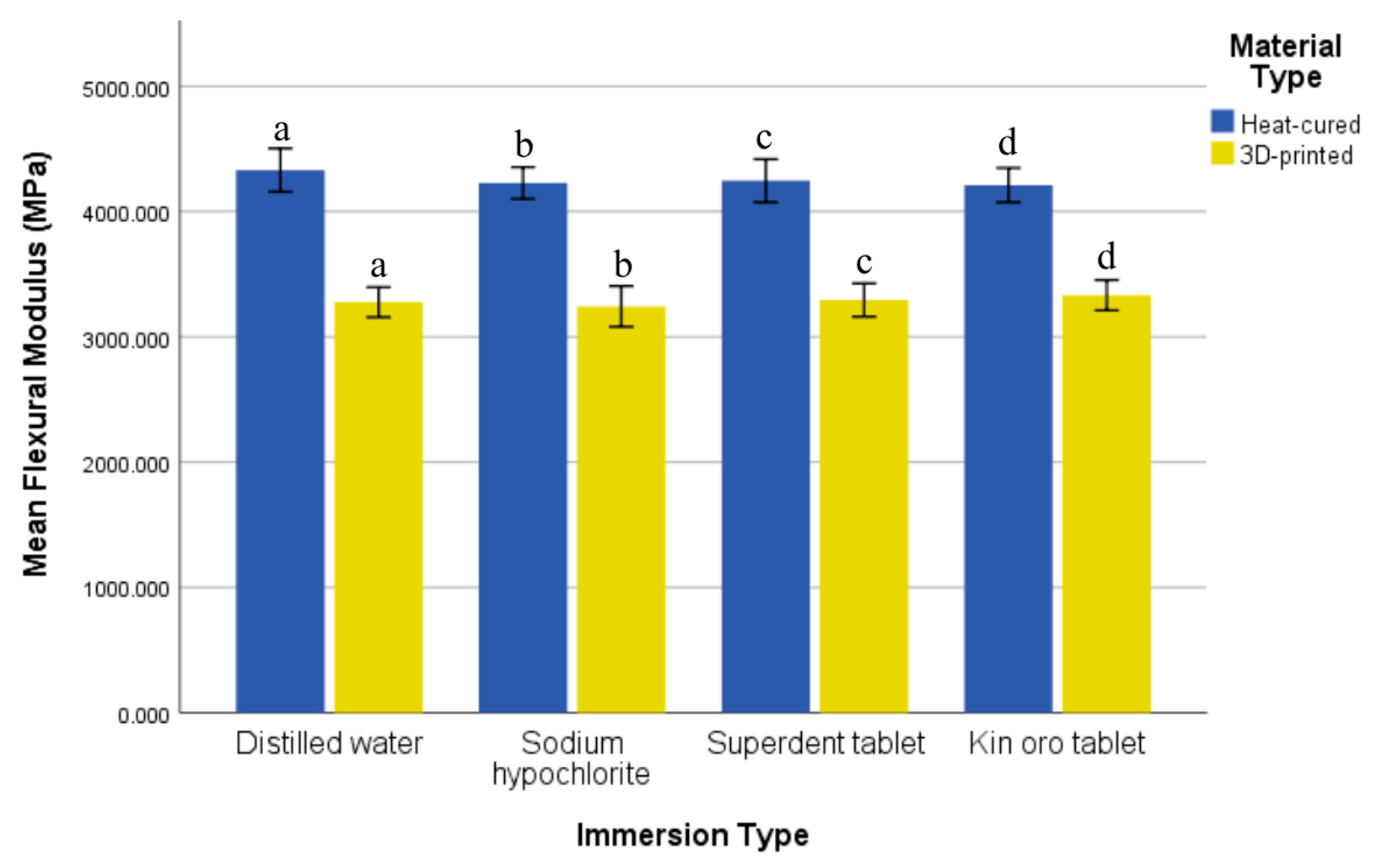 - Both resins exhibited the highest mechanical properties in distilled water, indicating minimal degradation in the absence of chemical disinfectants.