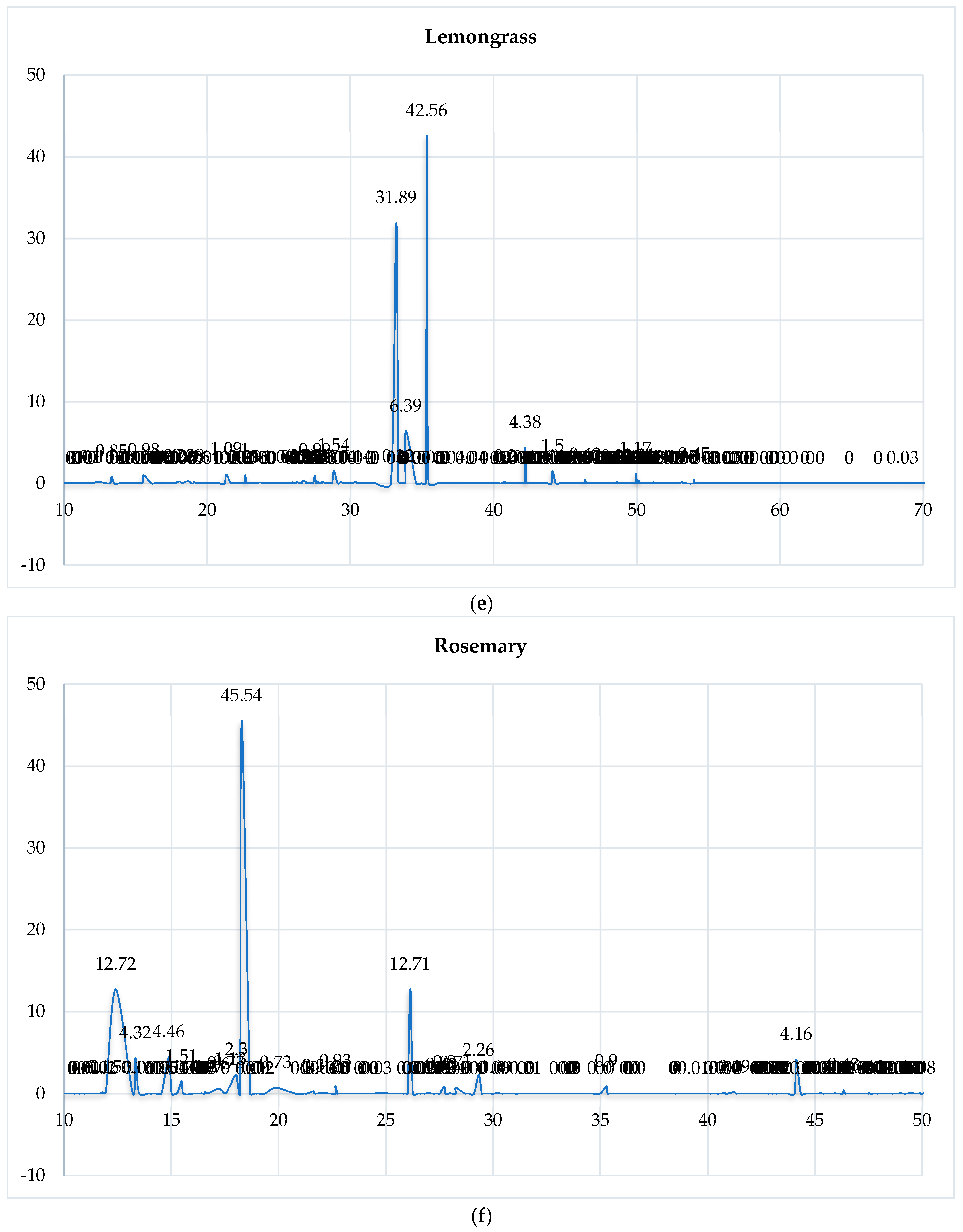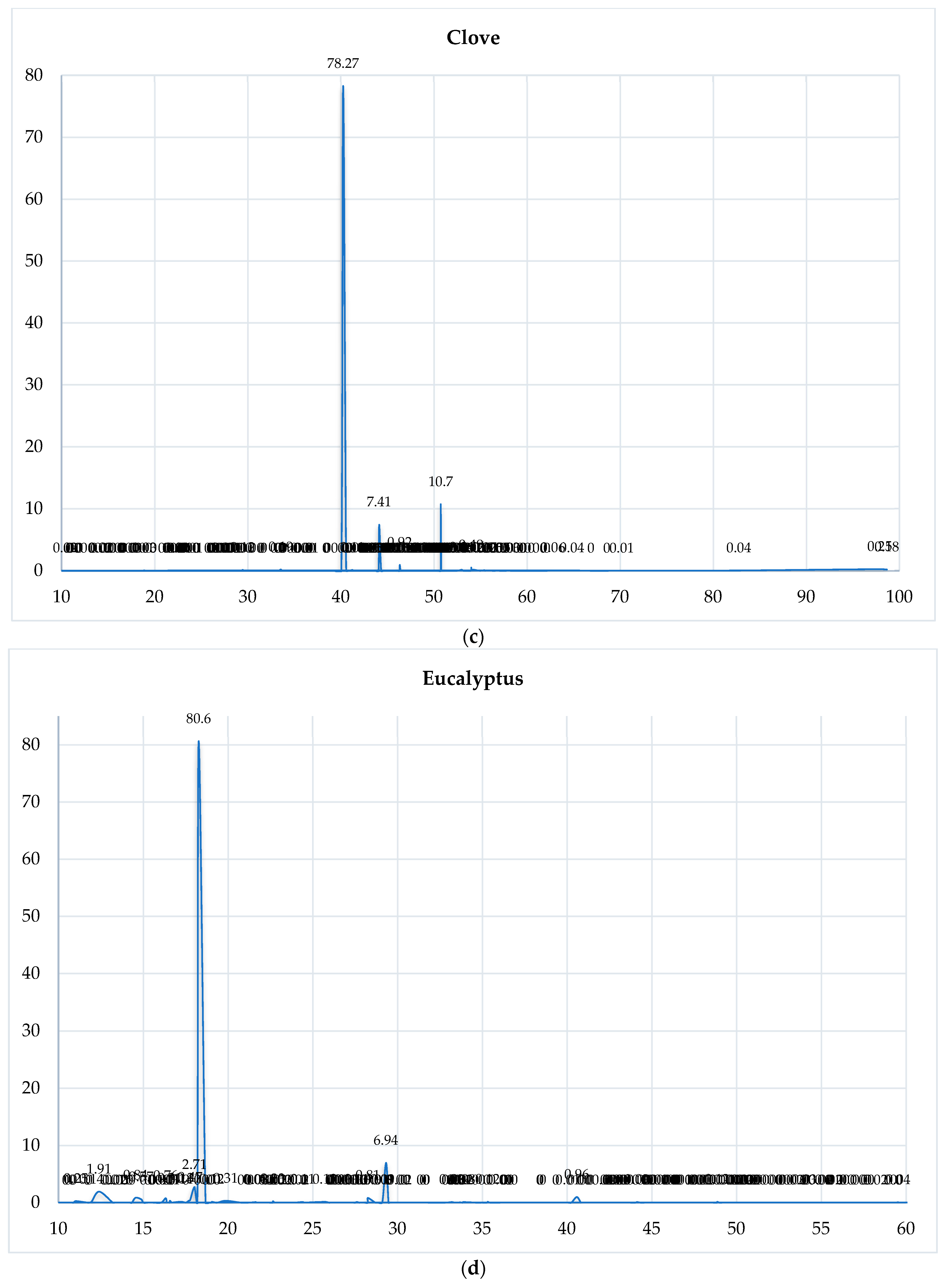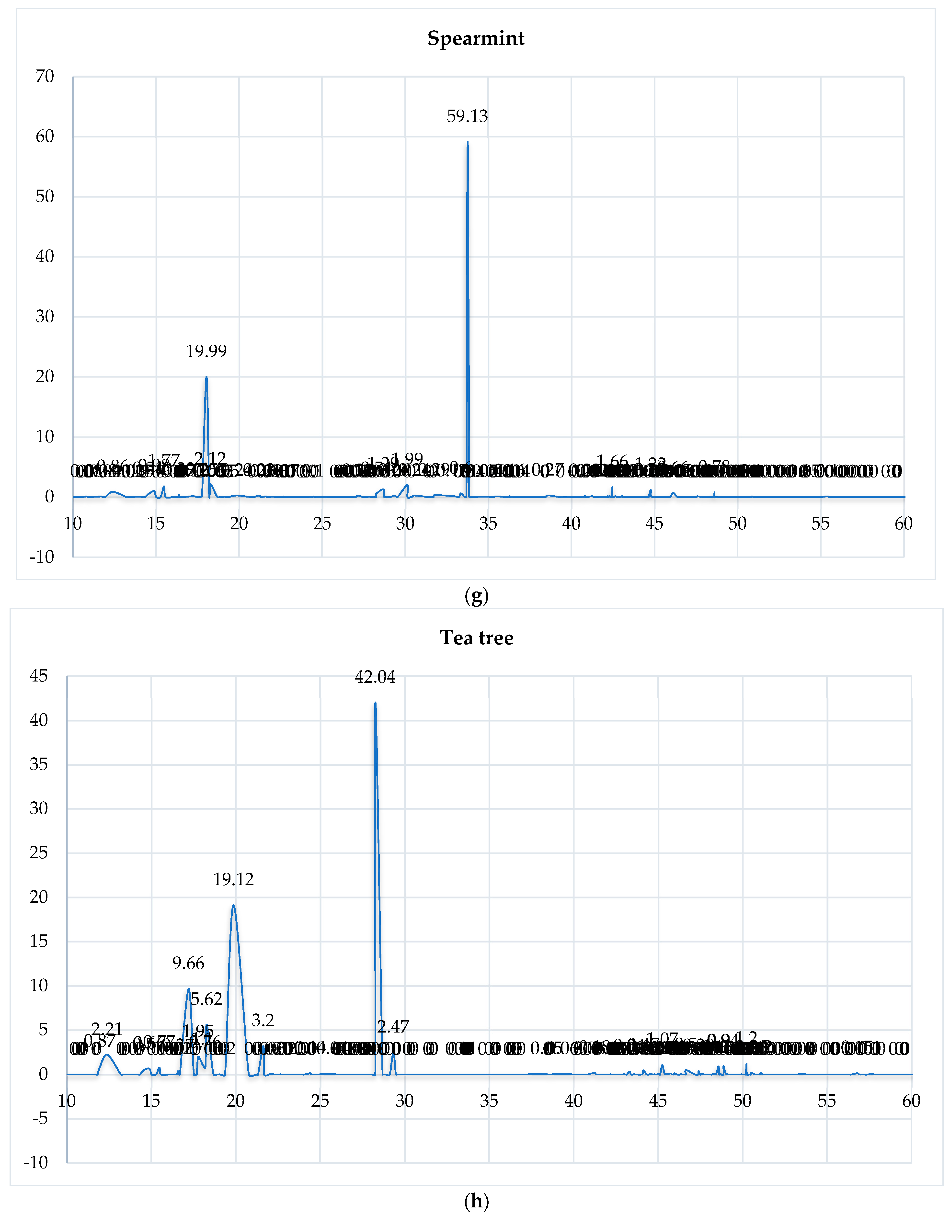 - Agatonovic-Kustrin, S.; Ristivojevic, P.; Gegechkori, V.; Litvinova, T.M.; Morton, D.W. Essential Oil Quality and Purity Evaluation via FT-IR Spectroscopy and Pattern Recognition Techniques. Appl. Sci. 2020, 10, 7294. [Google Scholar] [CrossRef]