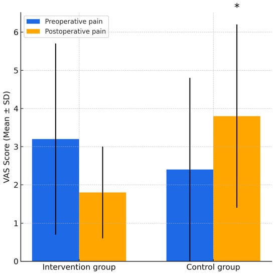Comparison of preoperative and postoperative VAS pain scores in the PRF and control groups. Error bars represent standard deviations. * indicates a statistically significant difference between groups in postoperative pain (p = 0.034, independent-samples t-test).