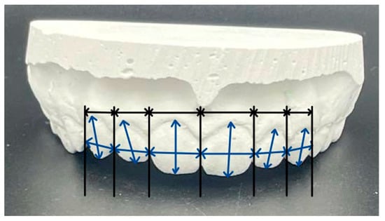 The dimensions of the six maxillary anterior teeth were measured directly on the study model using a digital caliper (RISEMART, Guangzhou, Guangdong, China), which had a measuring range of up to 150 mm and was precisely read to the nearest 0.1 mm, with a measurement accuracy of ±0.2 mm. The digital caliper was calibrated by zero-setting and verifying measurement consistency across its range to ensure accuracy before data collection. All measurements were performed by a board-certified orthodontist with over 10 years of working experience. The maximum width dimension of the teeth was obtained by measuring the distance between the tooth’s mesial and distal contact points perpendicular to the long axis. When measuring the crown length, the most apical point of the marginal gingiva to the incisal edge of the tooth was recorded on a line parallel to the long axis of the tooth. An accurate representation of the measurement with one of the participants’ tooth models is shown in Figure 1. All measurements were made of the facial surface of the tooth and recorded in millimeters. All data were recorded using Excel version 16.86 (Microsoft Excel 2023, Microsoft®, Redmond, WA, USA).