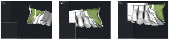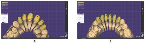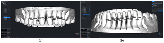 After carefully adjusting the digital contours of the bases, virtual models were generated, marking the beginning of the design phase for the future preparation guide. Once the model was scanned, the actual design process began. The design process started with defining the preparation margins. After all margins were established, the path of insertion and removal for the restorations was determined. In Figure 2a,b, the green arrows indicate a correct axis, while the red arrows signal an incorrect determination. Next, the parameters were selected to define the minimum thickness of the guide (Figure 3a,b).