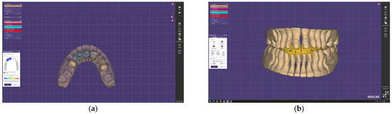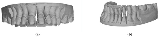 After positioning the samples on the scanning holder, the printed models were scanned together with the preparation guides placed on the teeth. During the analysis, approximately 3000 cross-sectional slices of the models were acquired, followed by the generation of three-dimensional reconstructions (Figure 10a,b).