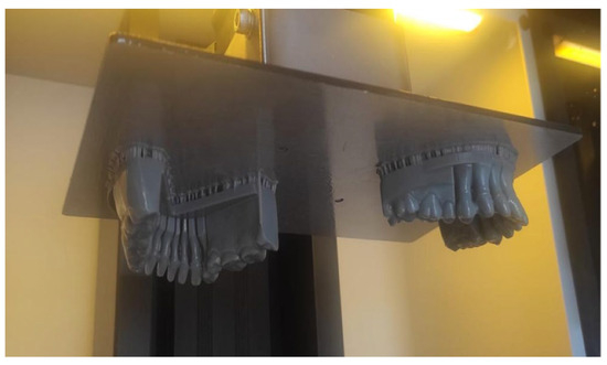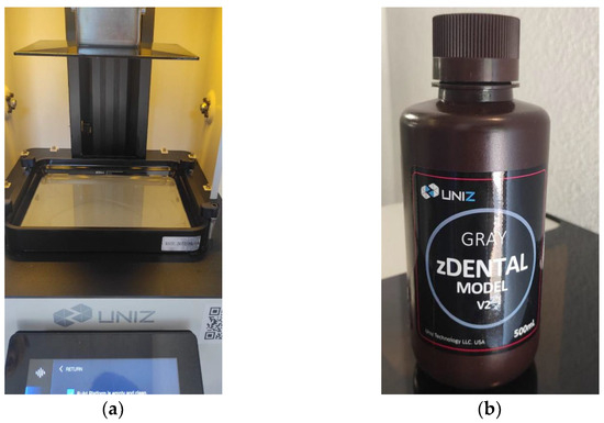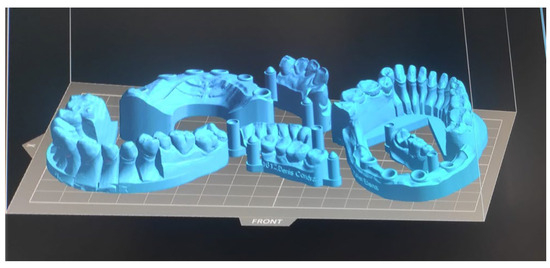 The models were positioned to facilitate no overlap between them, using the manufacturer’s software (UNIZ Desktop software). Following this step, the support structures were generated, and the file was processed for printing. The finalized file was then sent to the UNIZ 3D printer, which operates based on stereolithography (SLA) technology. The printer utilized a biocompatible resin, and the light curing of the resin layers was achieved using a laser beam (Figure 4a,b, Figure 5 and Figure 6).