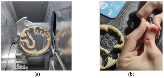 The final step involved additional light curing in a dedicated curing chamber, which completed the polymerization process and enabled the models to attain their optimal mechanical properties. This enhanced curing step was essential for ensuring long-term stability and durability. Collectively, these post-processing procedures were necessary for the finalization and refinement of the 3D-printed models (Figure 7a,b).