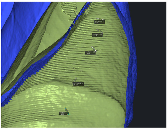 Three-dimensional reconstructions of the printed models and guides were used for descriptive analysis of the preparation geometry. Cross-sectional evaluation allowed visualization of the spatial relationship between the guide and the prepared tooth surfaces. The measured distances between the guide and the prepared surfaces varied across different teeth and regions, with values reported descriptively to illustrate the internal consistency of the guide geometry rather than to establish the quantitative accuracy (Figure 12a,b).