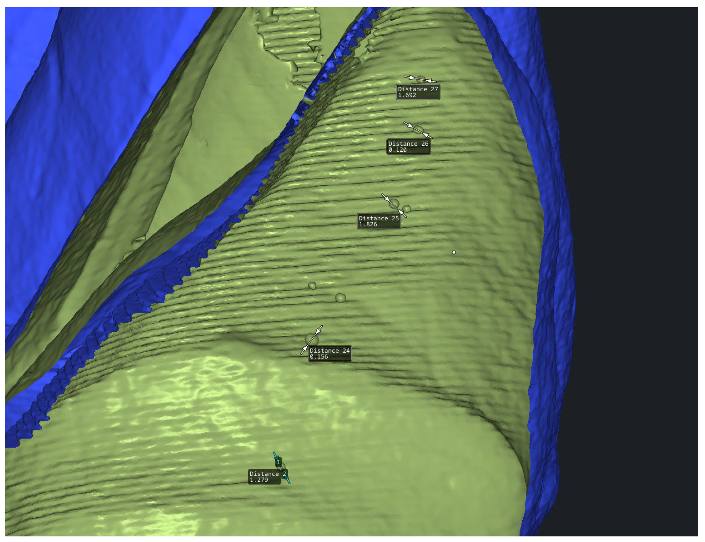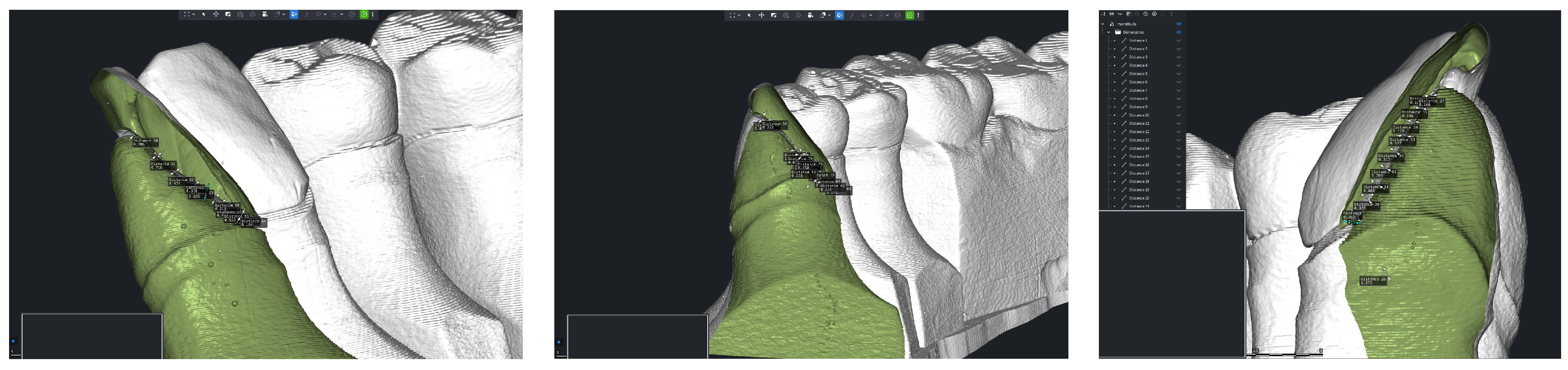 Three-dimensional reconstructions of the printed models and guides were used for descriptive analysis of the preparation geometry. Cross-sectional evaluation allowed visualization of the spatial relationship between the guide and the prepared tooth surfaces. The measured distances between the guide and the prepared surfaces varied across different teeth and regions, with values reported descriptively to illustrate the internal consistency of the guide geometry rather than to establish the quantitative accuracy (