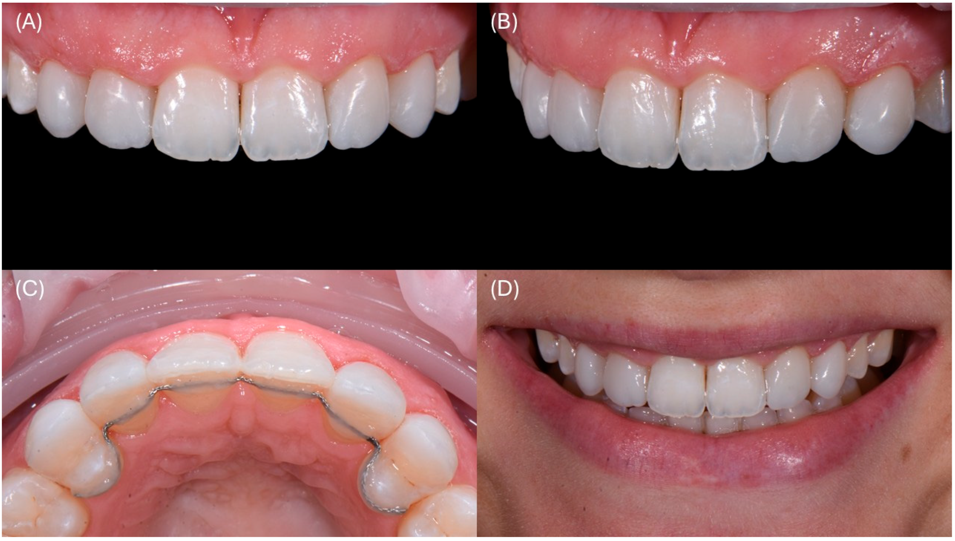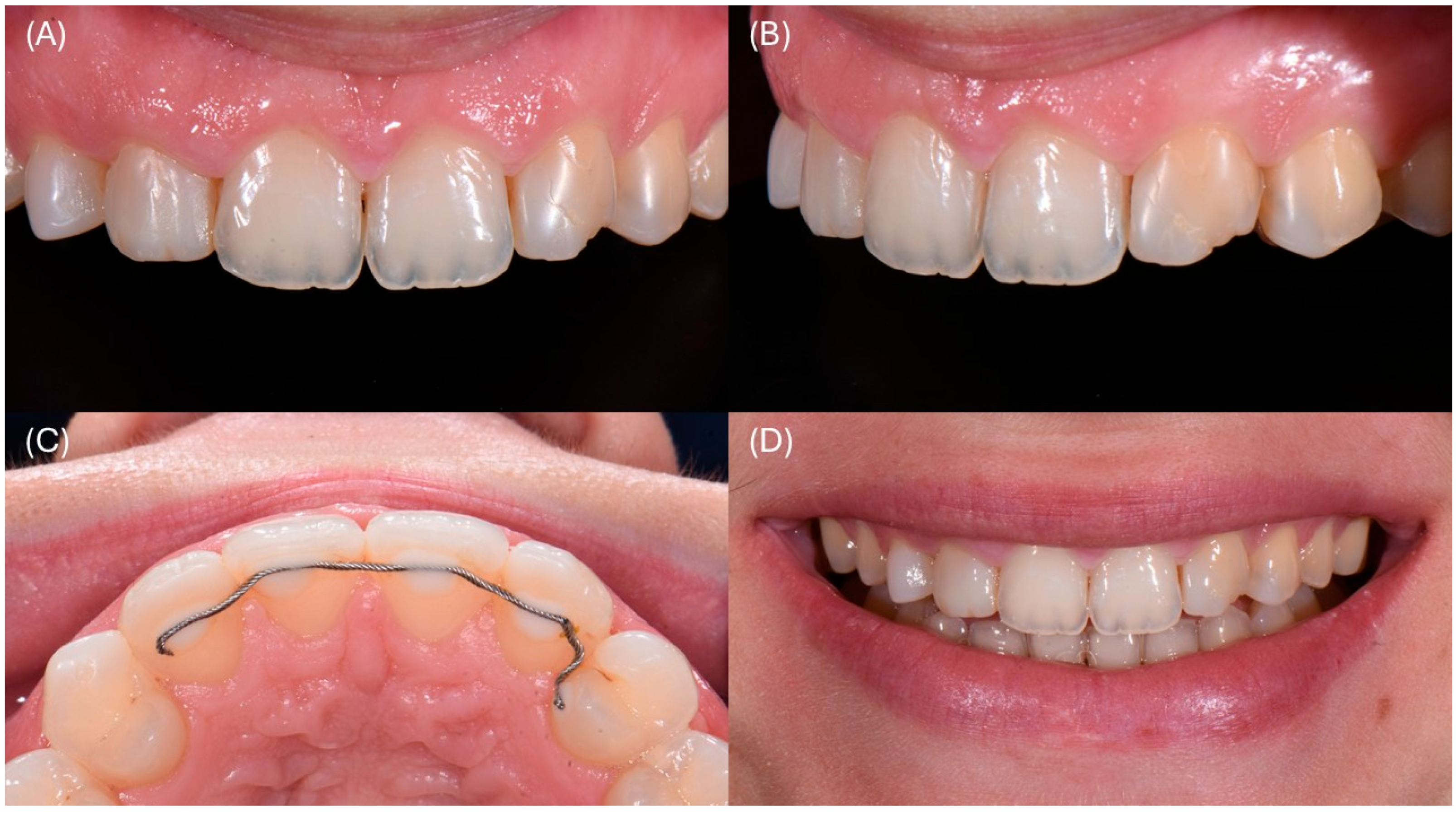 The patient revealed that she had previously undergone orthodontic treatment due to the congenital absence of her upper lateral incisors. After orthodontic treatment, composite veneers were placed to reshape the canines as lateral incisors and the premolars as canines. This orthodontic–restorative approach is commonly indicated in cases of maxillary lateral incisor agenesis presenting with a mildly convex facial profile and Angle Class II occlusion, provided that functional guidance is achieved and occlusal interferences and periodontal complications are absent. Upon clinical examination, these veneers exhibited poor surface texture and gloss, compromised marginal adaptation, and a crack on the incisal edge of the upper left canine. A post-orthodontic retention wire was placed in the palatal surfaces of the upper anterior teeth which was also fractured. Initial intraoral and extraoral photographs (