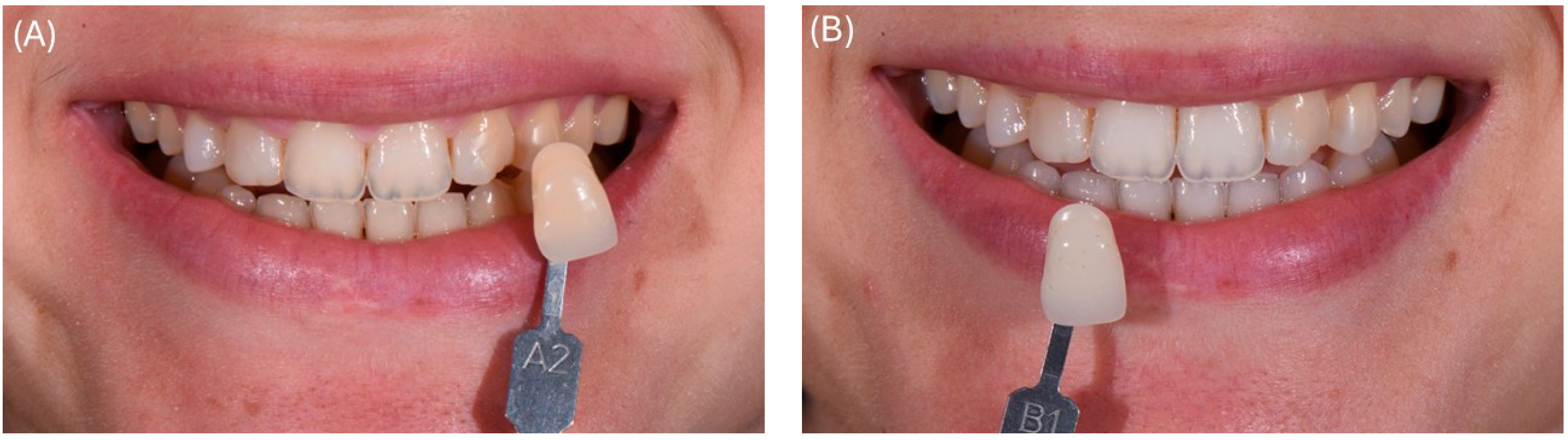 The A 23-year-old female, non-smoker patient was referred to the Postgraduate Clinic of Restorative Dentistry at the National and Kapodistrian University of Athens, Greece, for replacement of old, fractured veneers. The patient sought to improve both the color and shape of her teeth utilizing the least invasive approach and firmly declined any surgical interventions from the outset. Her medical history was unremarkable, with no medications being taken at the time of consultation.