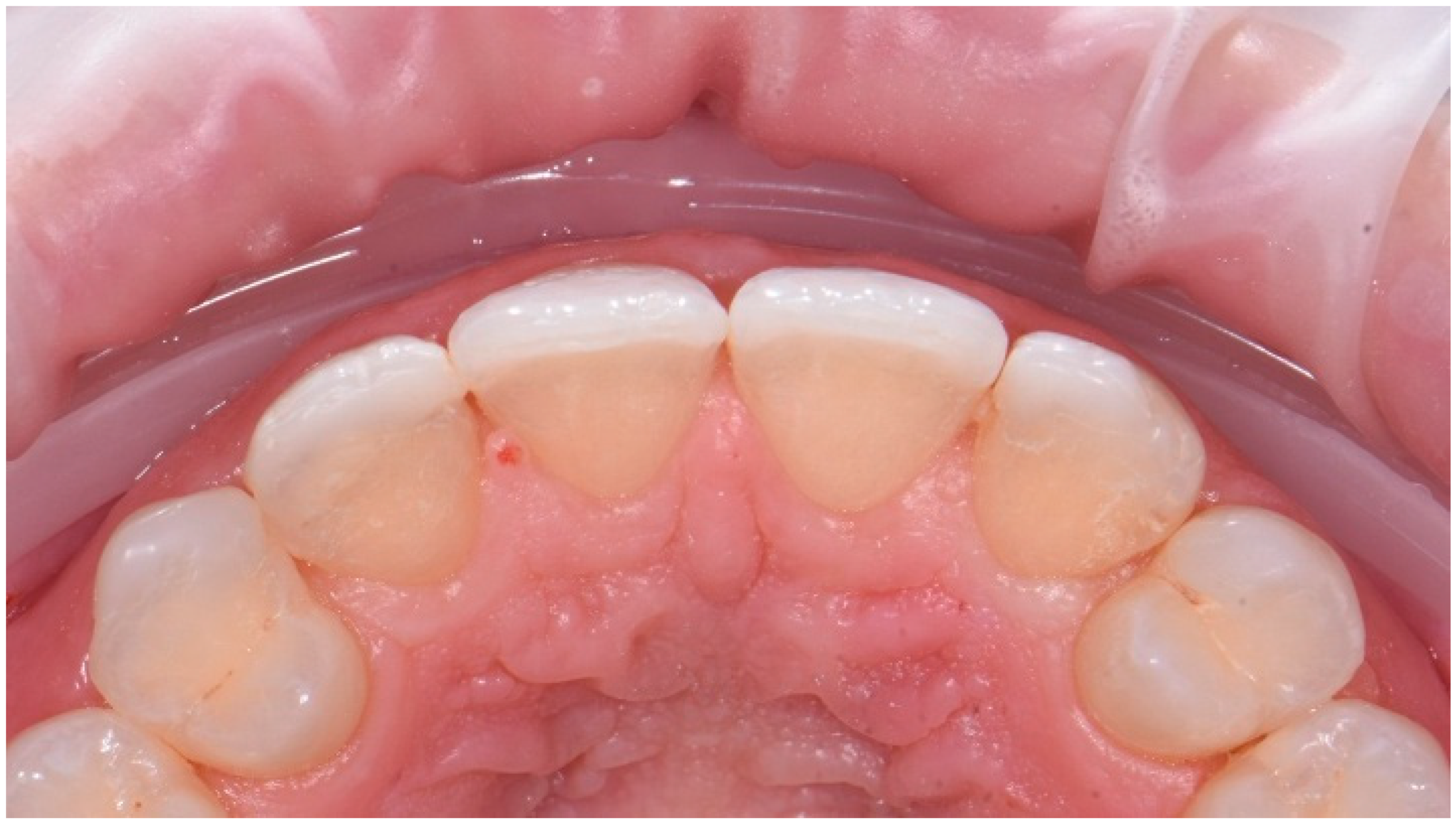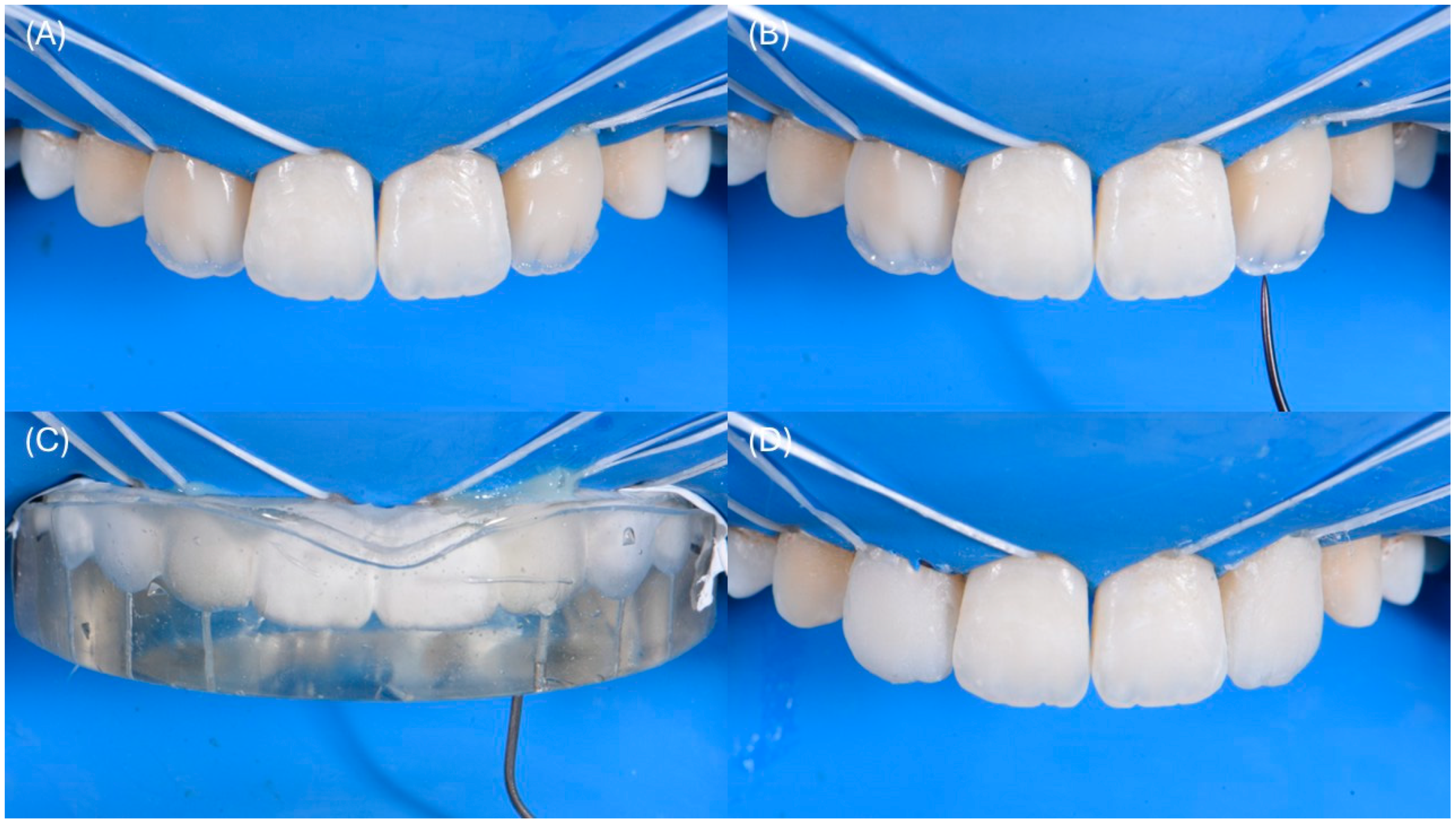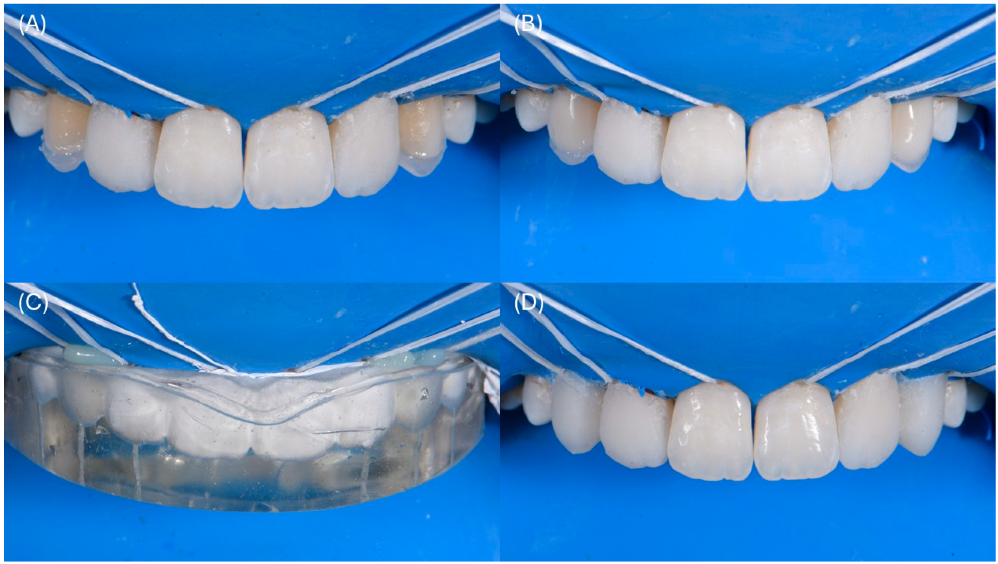 Figure 9). Excess composite material was meticulously removed using a No. 12 scalpel blade and interproximal sandpaper strips (Epitex, GC Corp., Tokyo, Japan) until all excess was eliminated, ensuring no gaps and achieving the optimal contour of the injected teeth.