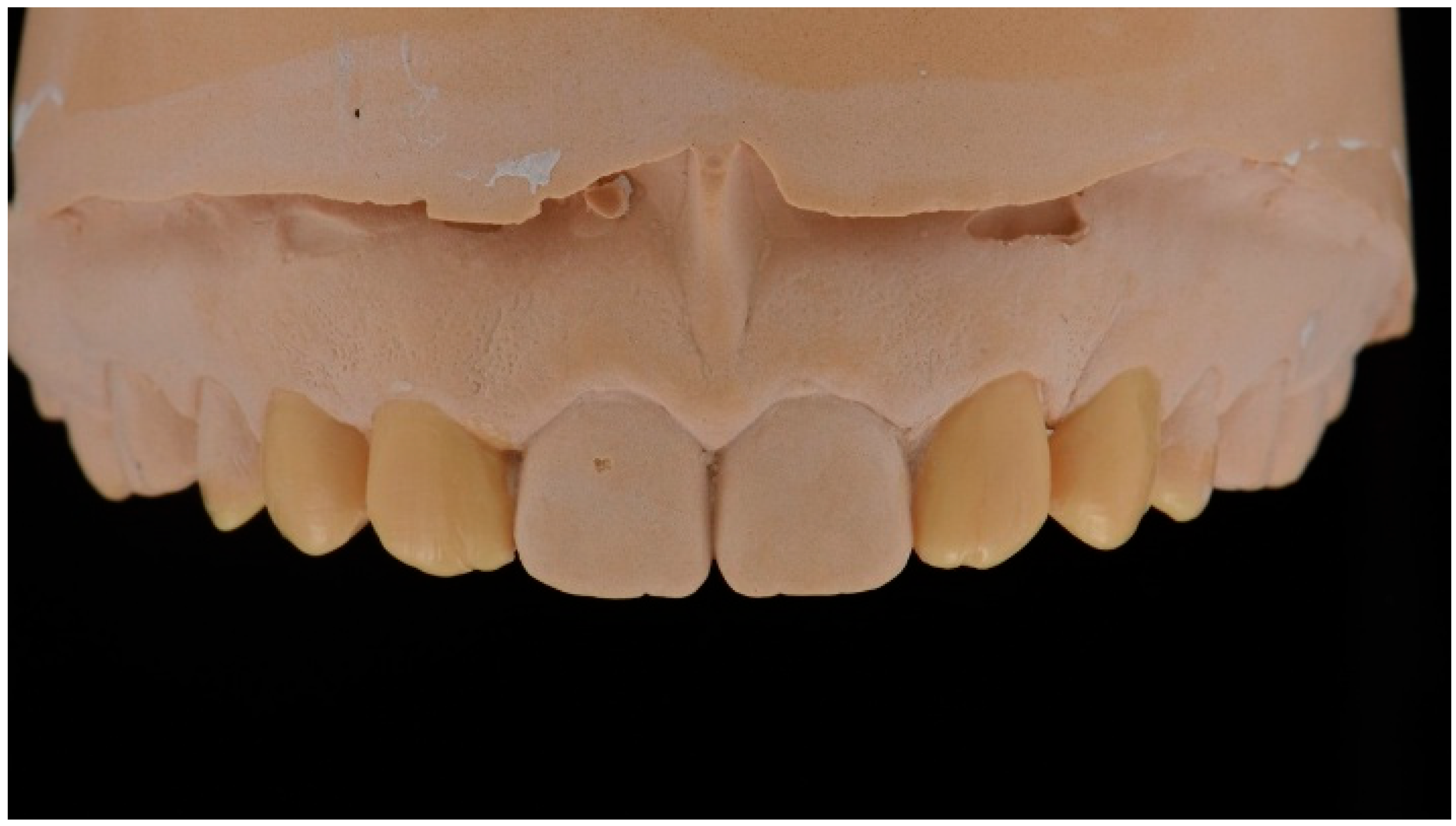 Figure 3), an alginate impression (Hydrogum 5, Zhermack SpA, Badia Polesine, Italy) was taken and die stone (New Fuji Rock, GC Corp., Tokyo, Japan) was poured immediately to create a cast model. In collaboration with our lab technician, an analog wax-up was fabricated to alter the shape of the proposed teeth, maintaining harmony with the central incisors, which remained intact (