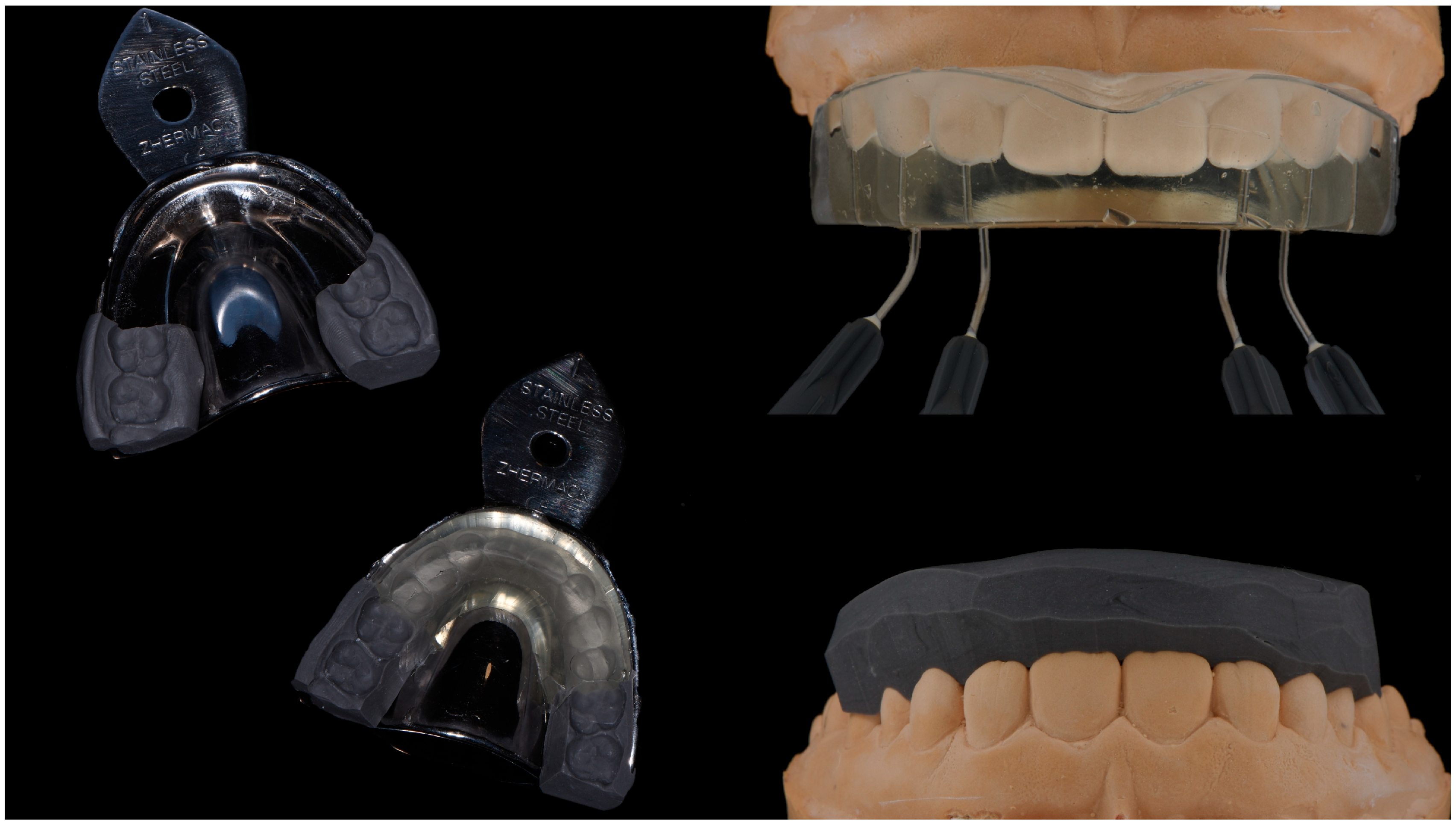 Figure 5). The clear index was fabricated in the appropriate thickness of 7–10 mm to avoid distortion during placement. After removing the excess silicone with a scalpel and verifying the accurate fit of the index on the model, perforations for the injectable composite were made from the inside, along the long axis of the tooth, positioned centrally on the incisal edge. These perforations were created using the same metal syringe tip that would later hold the flowable composite for the injection process.
