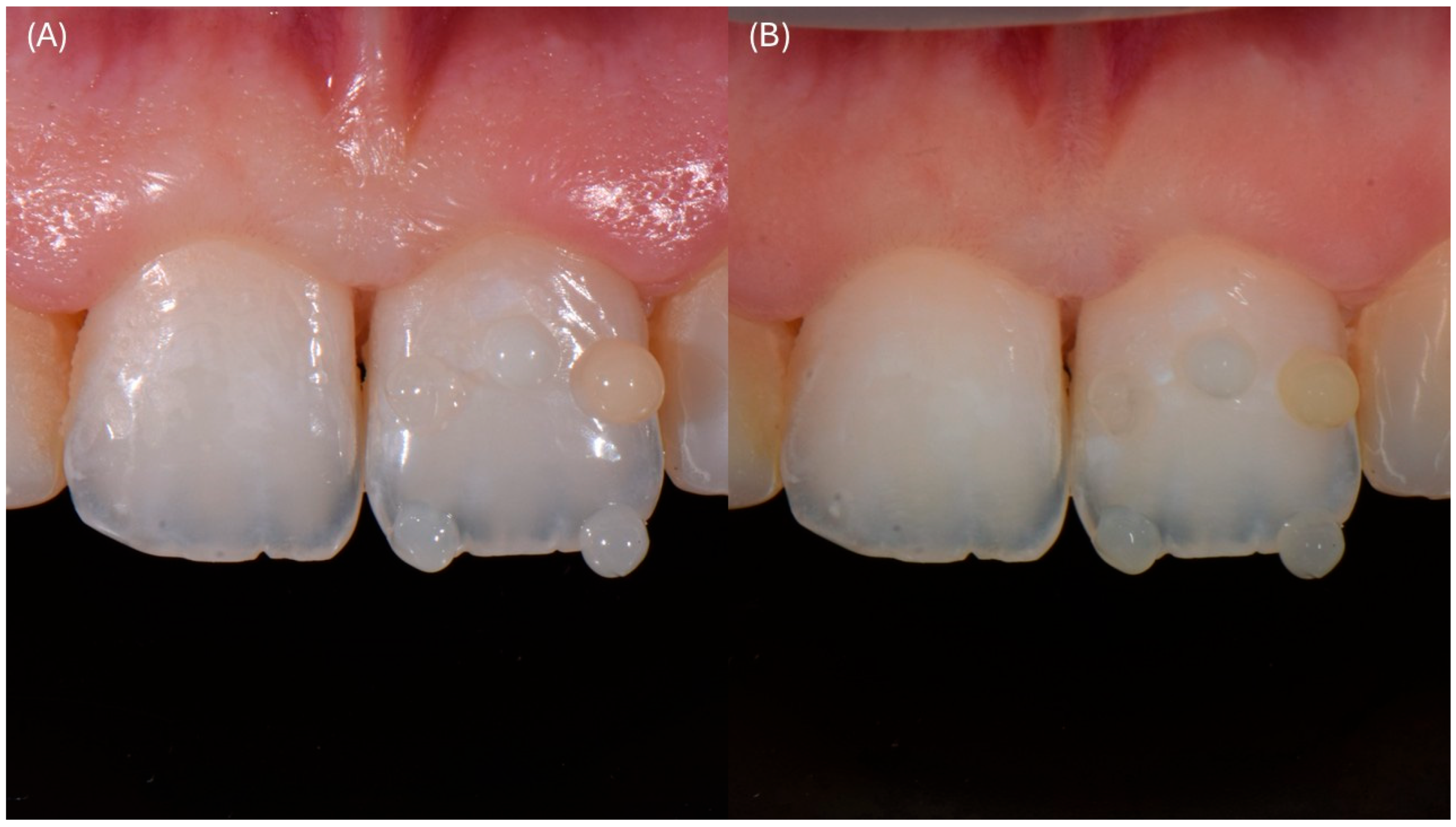 Following professional cleaning and calculus removal, at-home bleaching was carried out using custom-made trays with 10% carbamide peroxide (Opalescence PF 10%, Ultradent Products, Inc., South Jordan, UT, USA) applied once daily for four weeks (