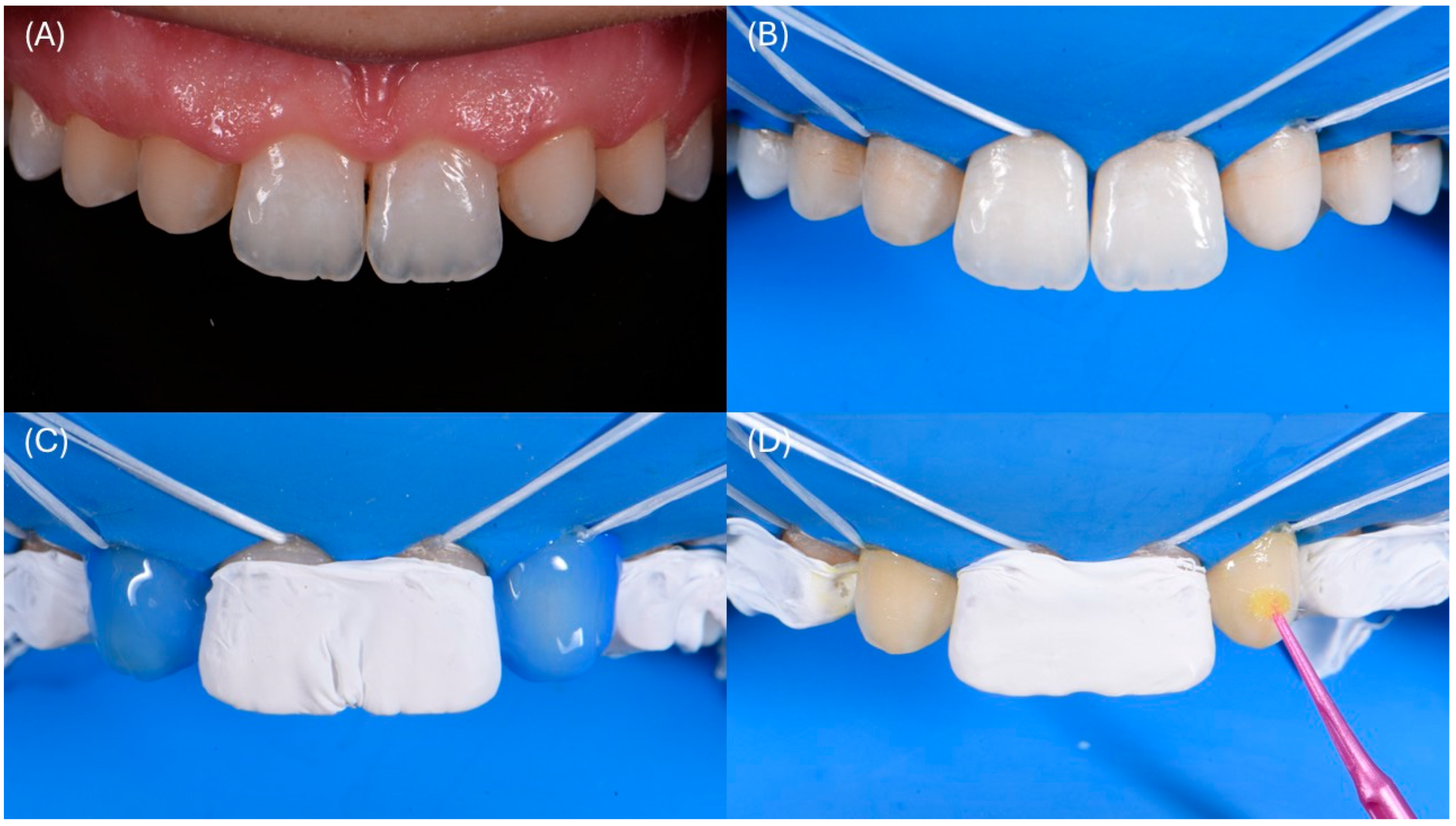 After careful removal of the existing composite veneers, rubber dam (NicTone Heavy, MDC, Jalisco, Mexico) was applied to multiple teeth and optimal gingival retraction was achieved with dental floss ligatures. First, both canines were etched with 35% orthophosphoric acid for 30 s (K-etchant Syringe, Kuraray Noritake Dental Inc., Tokyo, Japan), while neighboring teeth were protected with PTFE tapes. After thorough rinsing and drying, a universal adhesive (G-Premio Bond, GC Corp., Tokyo, Japan) was applied to the etched surfaces, air-thinned for 5 s under maximum air pressure, and light-cured for 10 s per tooth. Light curing was performed using an LED curing unit (Bluephase PowerCure, Ivoclar Vivadent, AG, Schaan, Lietschentein) with an output intensity of approximately 1200 mW/cm
