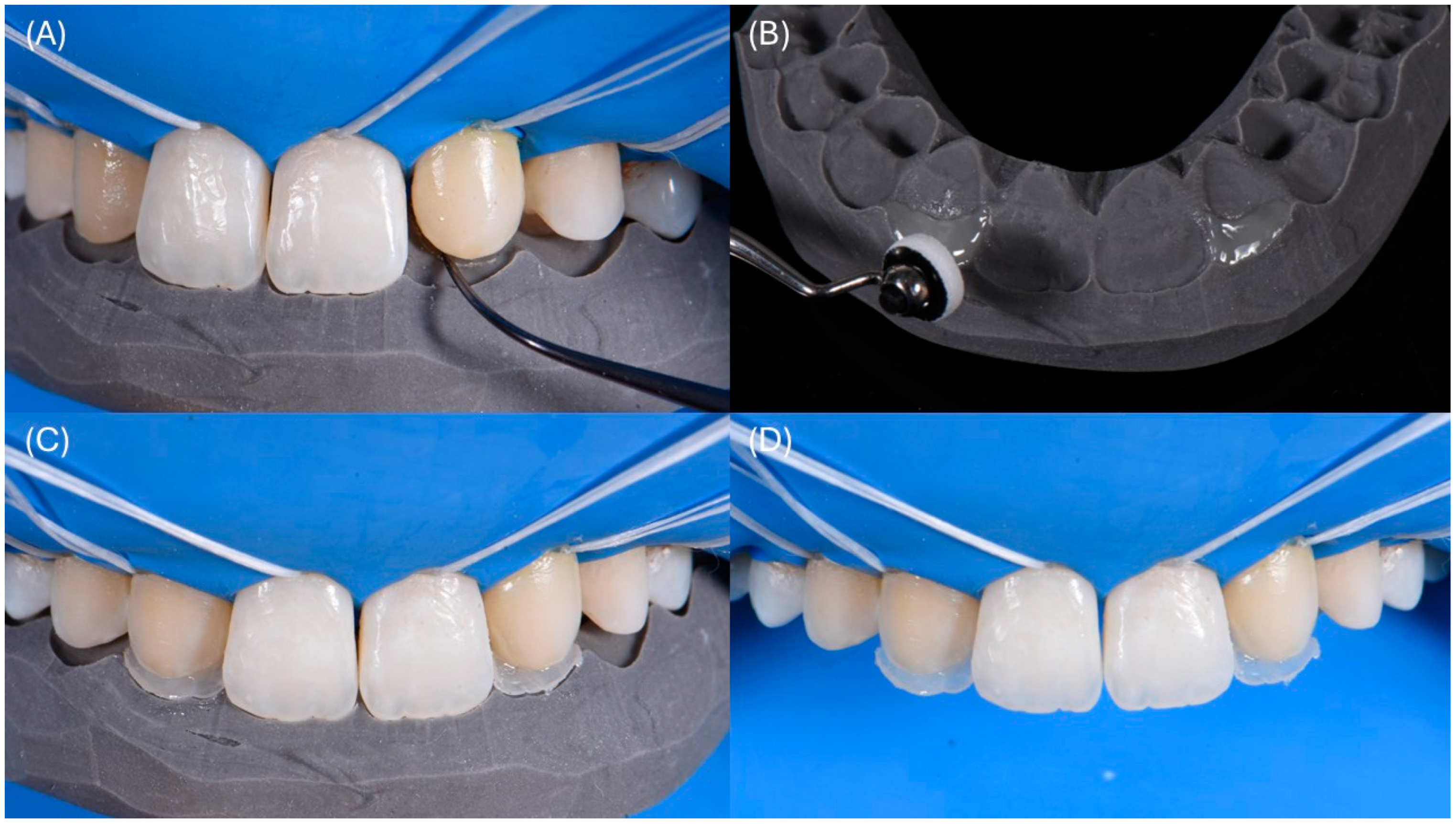 15] introduced a multilayering protocol utilizing an opaque composite to mimic dentin and a translucent one to replicate enamel. This approach involved two digital wax-ups: a full-contour anatomic wax-up and a second representing a dentin core with a 0.5 mm labial and incisal reduction. Each wax-up was used to fabricate a corresponding silicone index. This was the first multilayer approach documented in the literature; however, the technique was applied to missing teeth reconstructed via injection molding as part of a direct resin-bonded fixed dental prosthesis. A subsequent report described a similar multilayering technique, which was also applied in a case involving a missing tooth [