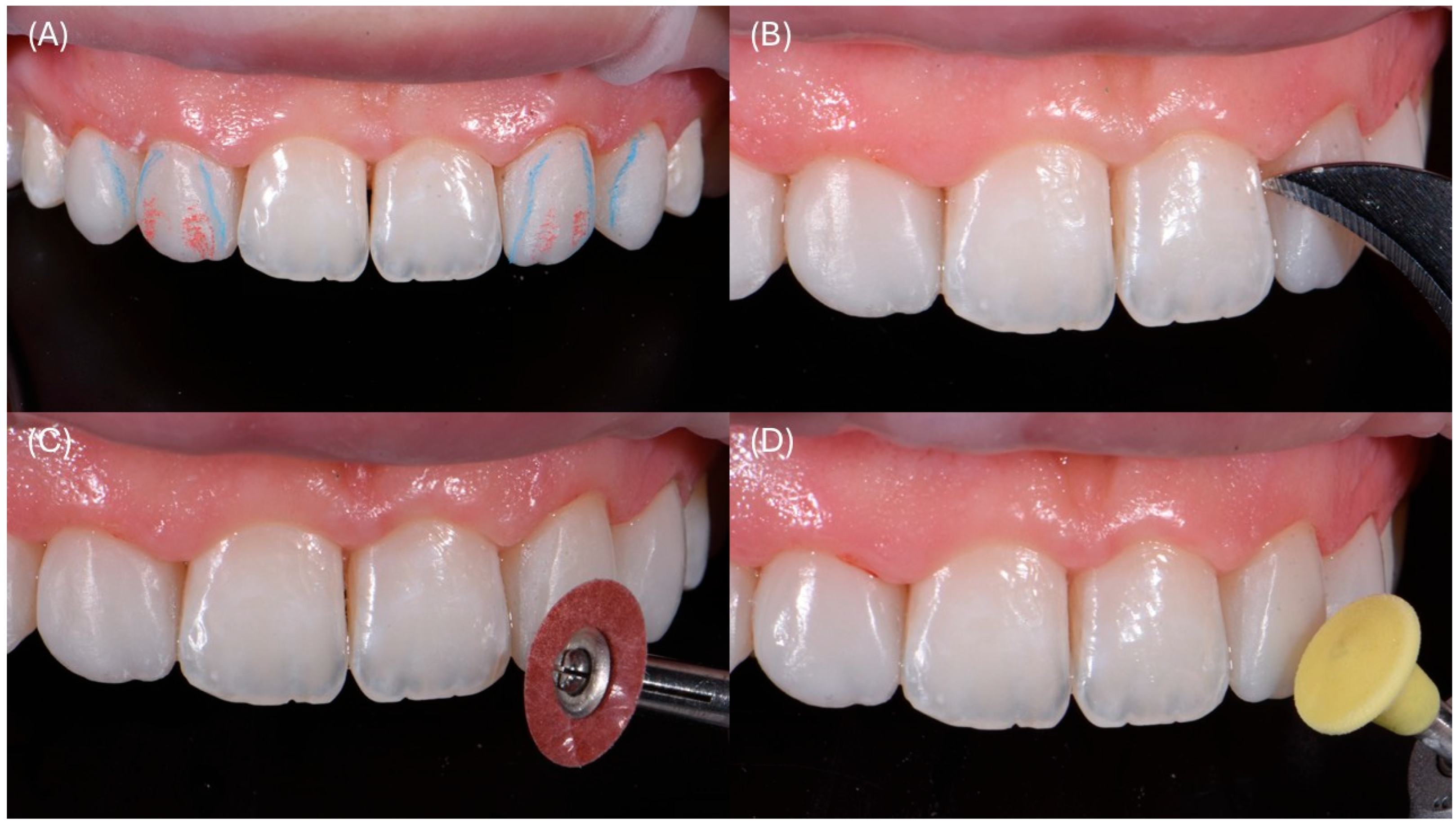 Figure 11), particularly in the cervical and interproximal areas, is facilitated by a No. 12 scalpel blade and finishing sandpaper strips. Special care must be taken during this step, as excessive finishing with strips on the proximal surfaces can lead to open contact points and potential food entrapment. Fine diamond burs are highly effective for contouring the cervical area, ensuring a smooth transition from natural tooth structure to restoration, without overhanging margins. Minimal adjustments were required on the buccal surface, as the wax-up was precisely transferred. A 12-μm (12μ OccluFoil, Hanel/Coltene, Altstatten, Switzerland) articulating paper was used to assess occlusal contacts. Only minimal occlusal adjustments were required, thanks to the technique’s precise replication of the wax-up in the final restorations. Transition lines were drawn using a pencil and minor adjustments were made with aluminum oxide-coated disks (Sof-Lex, 3M Oral Care, Minneapolis, MN, USA). Polishing was achieved using a three-step composite polishing system, with elastic disks (Jiffy, Ultradent Products, Inc., South Jordan, UT, USA) and diamond paste (Lucida, Diashine, Lynnwood, WA, USA) at low RPM and low pressure to enhance gloss and preserve surface texture. Finally, a new orthodontic retainer was applied.