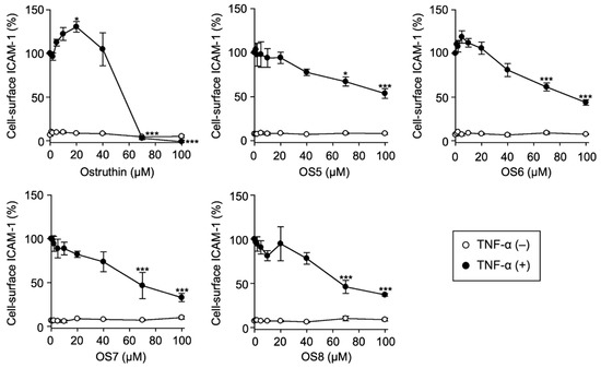 Ostruthin, OS5, OS6, OS7, and OS8 inhibited cell-surface ICAM-1 expression. A549 cells were treated as described in Figure 2. Cell-surface ICAM-1 levels were evaluated by cell-ELISA. ICAM-1 expression (%) represents the mean ± S.E. of three independent experiments. * p < 0.05 and *** p < 0.001.