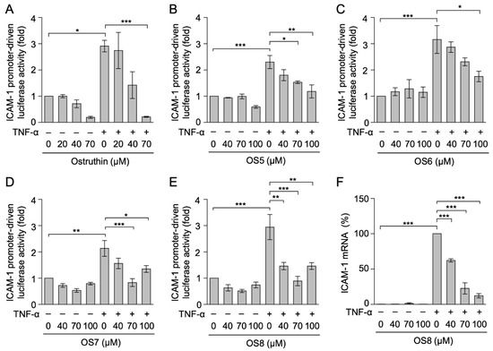 Ostruthin, OS5, OS6, OS7, and OS8 inhibited TNF-α-induced ICAM-1-promoter-driven luciferase activity. (A–E) A549 cells were transfected with ICAM-1 promoter-driven and control cytomegalovirus promoter-driven luciferase reporter plasmids. Transfected A549 cells were treated with serial dilutions of ostruthin (A), OS5 (B), OS6 (C), OS7 (D), or OS8 (E) for 1 h, and were then incubated without (−) or with (+) TNF-α (2.5 ng/mL) for 2.5 h in the presence of test compounds at the final concentrations (0–100 µM). Luciferase activity (fold) represents the mean ± S.E. of three independent experiments. * p < 0.05, ** p < 0.01, and *** p < 0.001. (F) A549 cells were preincubated with different concentrations of OS8 for 1 h, and were then incubated without (−) or with (+) TNF-α (2.5 ng/mL) for 2 h in the presence of OS8 at the final concentrations (0–100 µM). The amount of ICAM-1 mRNA was analyzed by real-time PCR. ICAM-1 mRNA (%) represents the mean ± S.E. of three independent experiments. *** p < 0.001.