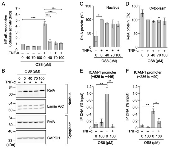 Based on the above results, we speculated that OS8 may prevent the binding of RelA to the ICAM-1 promoter. Multiple NF-κB-responsive sites were previously reported to be located in the ICAM-1 promoter [30,32]. A ChIP assay was performed to investigate the direct binding of RelA to these NF-κB-responsive sites. The binding of RelA to the ICAM-1 promoter was markedly increased by the TNF-α stimulation (Figure 6E,F). OS8 at 100 µM significantly suppressed the increase in RelA binding (Figure 6E,F). These results indicated that OS8 prevented the binding of RelA to the ICAM-1 promoter, which accounted for the reduction in ICAM-1 mRNA expression.