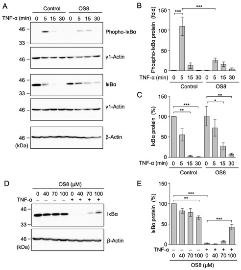 To elucidate the mechanisms by which OS8 inhibits the binding of RelA to the ICAM-1 promoter, we examined the phosphorylation of components of the NF-κB signaling pathway. In A549 cells, the results of the time-course experiment showed that the TNF-α stimulation induced the phosphorylation of IκBα within 5 min, which was followed by the degradation of IκBα within 15 min (Figure 7A–C). OS8 at 100 µM markedly diminished TNF-α-induced IκBα phosphorylation (Figure 7A,B). In contrast, TNF-α-induced IκBα degradation was delayed, but proceeded for 30 min in the presence of OS8 (Figure 7A,C). This result is consistent with OS8 not markedly affecting the nuclear translocation of RelA 30 min after a stimulation with TNF-α (Figure 6B,C). The results of the dose-dependent experiment showed that OS8 at 100 µM suppressed the degradation of IκBα to some extent 15 min after the TNF-α stimulation (Figure 7D,E).