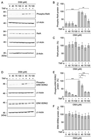 ERK1 and ERK2 were phosphorylated in A549 cells stimulated with TNF-α (Figure 8D,E). The TNF-α-induced phosphorylation of ERK1/ERK2 was inhibited by OS8 without affecting total ERK1/ERK2 levels (Figure 8D–F). Collectively, the present results indicate that OS8 inhibited the TNF-α-induced phosphorylation of RelA and ERK1/ERK2.