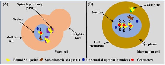 So far, shugoshin has been detected or observed in the nucleus in close association with chromosomes at the kinetochore or centromere, in the spindle pole body (or SPB, the functional equivalent of centrioles of higher eukaryotes), and more recently in the sub-telomeric region of the chromosome [30,39,40,41,42,43]. Cellular localization of shugoshin in yeast and the mammalian cell is shown in Figure 1A,B, respectively. By looking at Figure 1, it can be inferred that the overall cellular localization of shugoshin is similar in yeast and mammalian cells despite a huge evolutionary distance. The similar cellular localization of shugoshin in yeast and mammalian cells shows the importance or suitability of yeast as a model system. It is important to mention that in budding yeast, the nuclear membrane always remains intact (closed mitosis), and the SPB always remains embedded in the nuclear envelope. In mammalian cells, the nuclear envelope is lost completely (open mitosis), and centrioles always remain in the cytoplasm. Therefore, the possibility of a novel shugoshin role and interactors in yeast as well as in mammalian cells cannot be ruled out. Thus, the identification of a novel function or interactors of shugoshin represents both opportunities and challenges to a contemporary biologist working in this direction. We give a comparative localization of human and yeast cells as a great deal of information related to shugoshin is gathered using yeast.