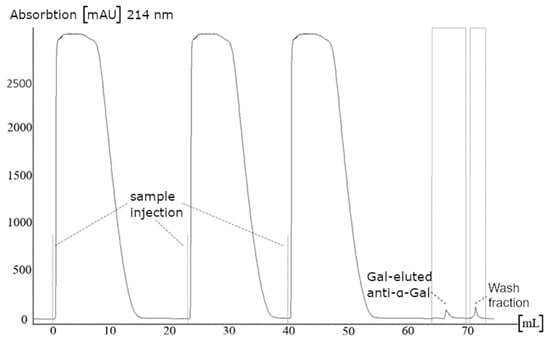 A threefold application of IgG was necessary to detect significant signals during elution. Collected fractions of several runs were pooled and the buffer was exchanged to PBS. The antibody concentration was adjusted to 1 mg/mL for further analysis. In earlier studies, anti-α-Gal antibodies were purified from human plasma by affinity chromatography using melibiose as affinity ligand [10,11,13]. Other affinity ligands such as α-Gal conjugated beads or bovine thyroglobulin were used [45,46].