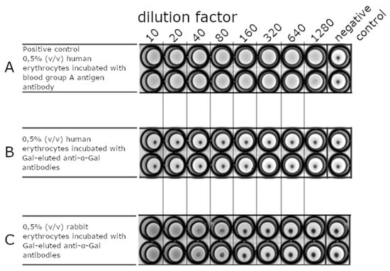 An erythrocyte agglutination assay was performed to provide further evidence of the selectivity of Gal-eluted anti-α-Gal antibodies (Figure 5). Different concentrations of anti-α-Gal antibodies were applied to a round-bottom well plate. Human and rabbit erythrocytes were added to the wells. Erythrocytes without antibodies served as a negative control. Cross-linked erythrocytes were visible as a fading surface in the round-bottom well when human blood group A erythrocytes were incubated with anti-human blood group A antibodies (Figure 5A). Unconnected cells slid down the round-bottom well, forming a dot (Figure 5, negative controls without the addition of antibodies). Anti-α-Gal antibodies bound to rabbit red blood cells in a concentration-dependent manner (Figure 5C), whereas human erythrocytes were not bound by anti-α-Gal antibodies at all (Figure 5B). These data confirm the literature, which emphasized that the α-Gal epitope is only present on rabbit erythrocytes [62,63] but not on human erythrocytes. Furthermore, the data demonstrate that purified anti-α-Gal antibodies did not show unspecific binding to the cell surface of human erythrocytes.