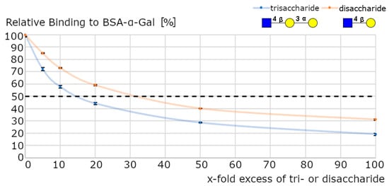 Surface plasmon resonance (SPR) measurements were performed to investigate dissociation constants of purified anti-α-Gal antibodies. Biotinylated glycan epitopes were coated on a streptavidin precoated sensor chip. Measurements with blood group A and blood group O epitopes were omitted since no binding was detected via ELISA. LacNAc, Galβ1,3-Gal, and an anticoagulation factor VIII antibody were used as negative controls. Purified anti-α-Gal antibodies only bound to the α-Gal epitope (KD = 144 ± 20 nM, n = 3) and to the α-Gal disaccharide (KD = 191 ± 18 nM, n = 3). The stabilizing effect of the additional GlcNAc-residue (GlcNAcβ1,4-Galα1,3-Gal) did not significantly affect the interaction. However, a higher affinity of the trisaccharide, compared to the disaccharide (Galα1,3-Gal), was shown by an inhibition assay. Anti-α-Gal antibodies were incubated with different excesses of either the trisaccharide or disaccharide. The binding to immobilized bovine serum albumin (BSA)-α-Gal was determined (Figure 6). Twice the amount of disaccharide than trisaccharide was necessary for a 50% inhibition of BSA-α-Gal binding.
