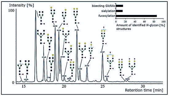 The glycosylation of antibodies has been extensively studied [72,73,74]. To characterize the N-glycosylation profile of purified anti-α-Gal antibodies, their N-glycans were enzymatically released with PNGase F. Enzymatically released N-glycans were labeled with fluorescent RapiFluor MS reagent, separated via hydrophilic interaction liquid chromatography (HILIC), and applied to the mass spectrometric analysis. The resulting N-glycan profile of purified anti-α-Gal antibodies revealed a typical human IgG-like glycosylation (Figure 7).