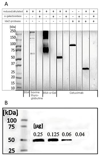 Different amounts of cetuximab were separated by SDS–PAGE, blotted, and developed with HRP-conjugated anti-α-Gal antibodies (Figure 8B) to evaluate the detection limit of anti-α-Gal antibodies. Cetuximab was detectable down to a value of 0.04 µg (0.28 pmol). The known molar amount of four α-Gal epitopes for cetuximab [79] reveals a detection limit of 1.12 pmol of α-Gal epitopes.