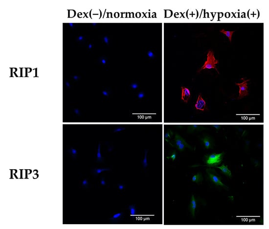 The presence/absence of RIP1 and RIP3 expression in Dex(+)/hypoxia(+) was investigated to confirm whether the conditions required for the development of necroptosis in osteocytic cells in an H-D stress environment were satisfied. Cultured cells were fixed in 4% paraformaldehyde, washed in phosphate buffered saline (PBS), and permeabilized with 0.3% Triton X-100 in PBS. Nonspecific binding was blocked by incubating sections with 10% bovine serum albumin (Dako Cytomation, Santa Clara, CA, USA) in PBS for 15 min. They were incubated with anti-RIP1 (Bioss, MA, USA) and anti-RIP3 (abcam, Cambridge, UK) antibody for 2 h at concentrations of 20.0 or 5.0 µg/mL, followed by a fluorescent-labeled secondary antibody (Alexa 594, or 488, Thermo Fisher Scientific, Waltham, MA, USA) and by DAPI for 30 min. After washing, a prolong diamond antifade mountant (Thermo Fisher Scientific) was added, and cover slips were mounted. Images were acquired using a Zeiss-LSM710.