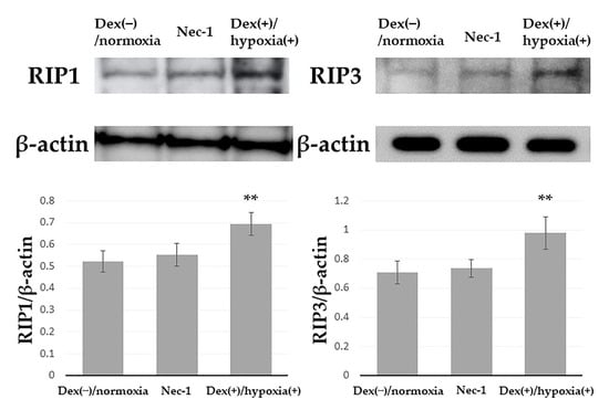 Inhibitory effect of necrostatin-1 on RIP1 and RIP3 by Western blotting. The graphs indicate quantification of Western blotting for RIP1 and RIP3 in the indicated conditions. The quantitative densitometric values of RIP1 or RIP3 were normalized to β-actin. Columns and bars indicate means and S.D., respectively, (n = 3). In Dex(+)/hypoxia(+) group expression of RIP1 (74 kDa), RIP3 (57 kDa) was found, while in Dex(+)/hypoxia(+)/Nec-1 group, there was significant inhibition of the expression of both RIP1 and RIP3 (** = p < 0.05). Three independent experiments each were carried out.